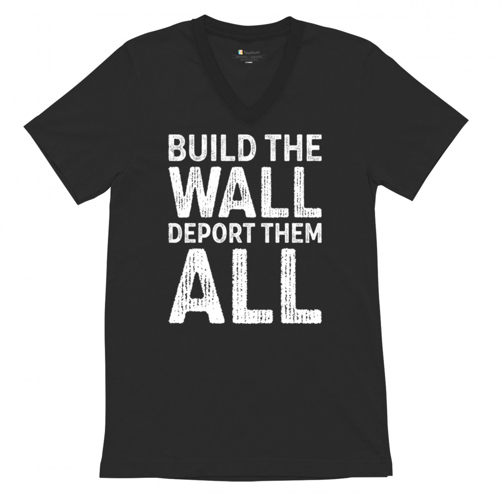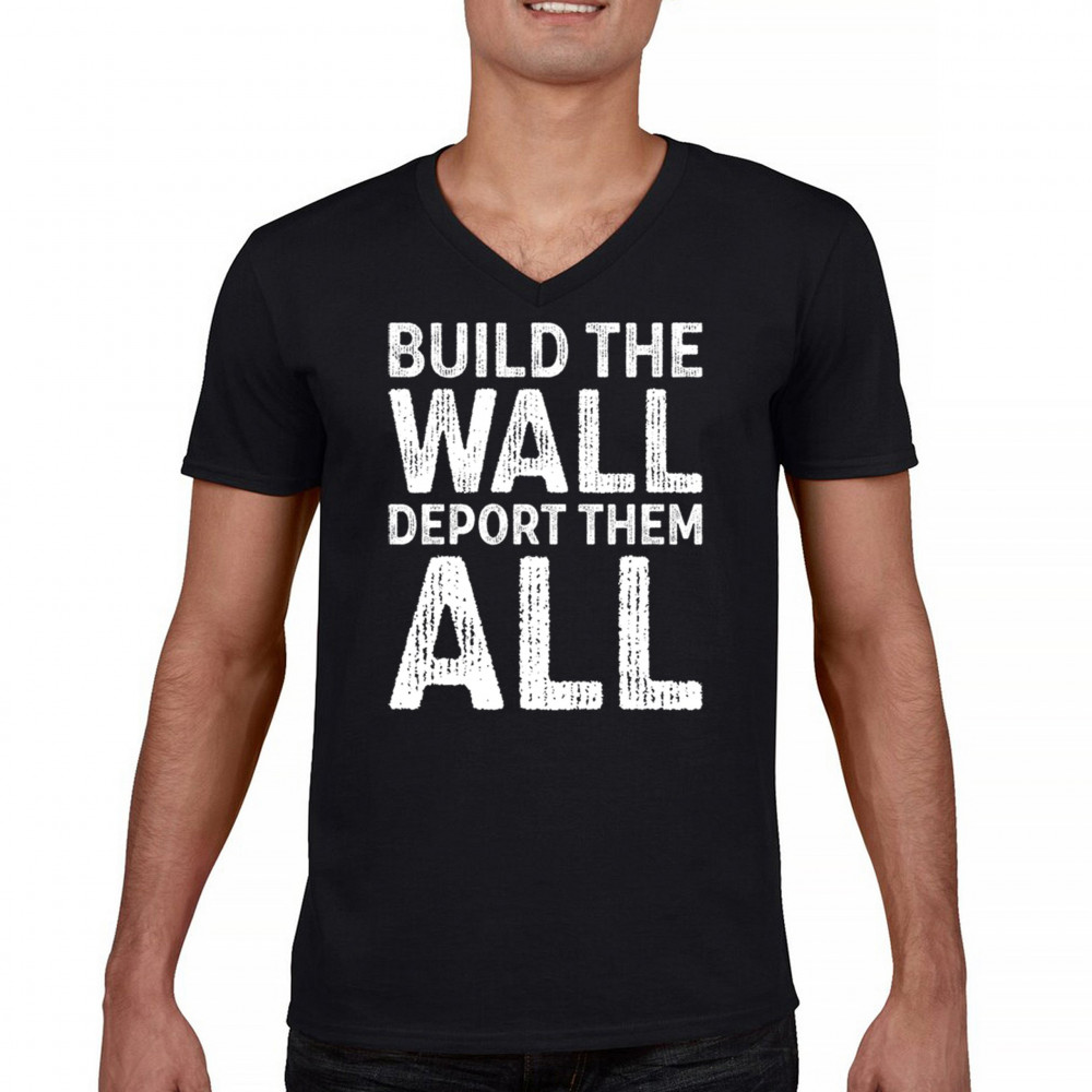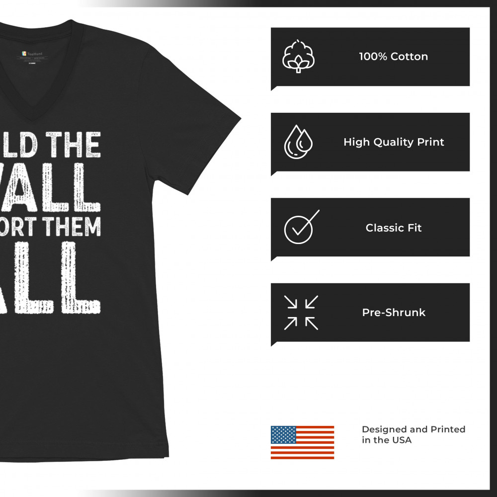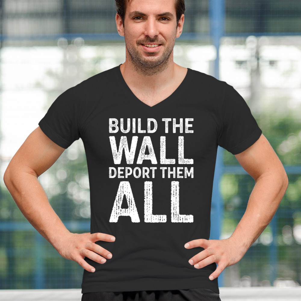 Stand strong for border security with our 'Build the Wall Deport Them All Trump 2024' tee. As a proud Trump supporter, join the America First movement and champion conservative values. Trust in God, not government, and reject the failed policies of Sleepy Joe. Let's go Brandon! Let the American flag wave high as we rally for victory in 2024.