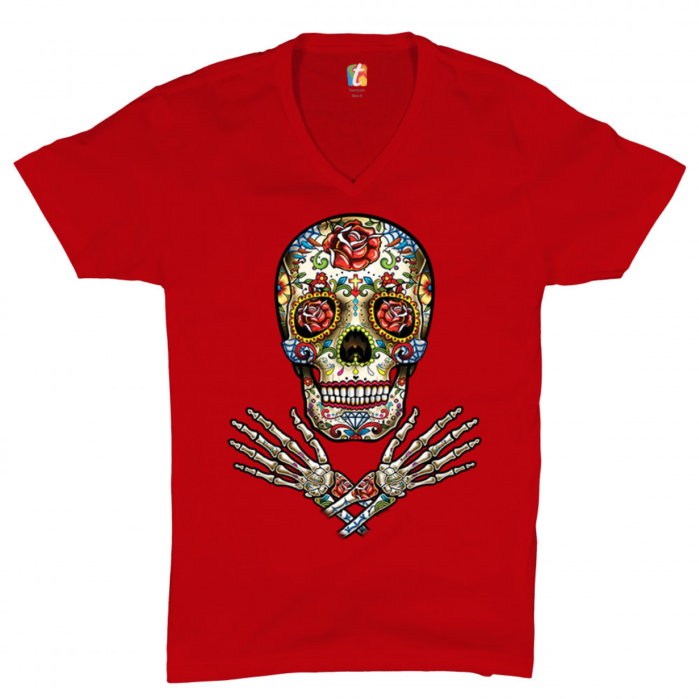 A huge print featuring a big calavera with roses in the eye sockets. There is a cross between the eyes and a huge rose on the forehead. Below the skull there are crossed arms. A great choice for anyone who upholds the traditions and celebrates the Day of