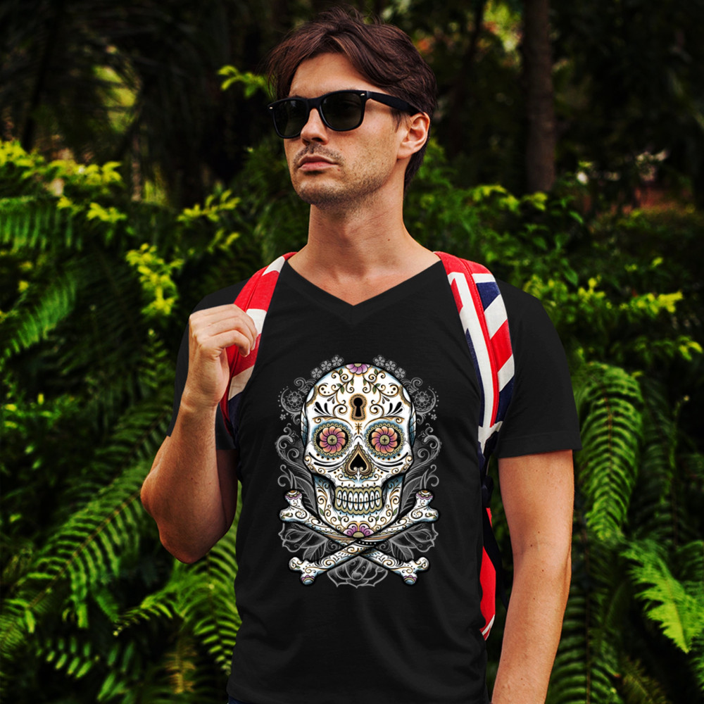 CALAVERA SUGAR SKULL v-neck t-shirt mexican day of the dead dia de muertos tee black