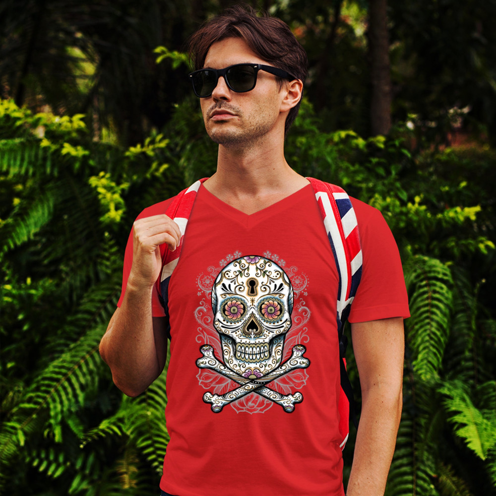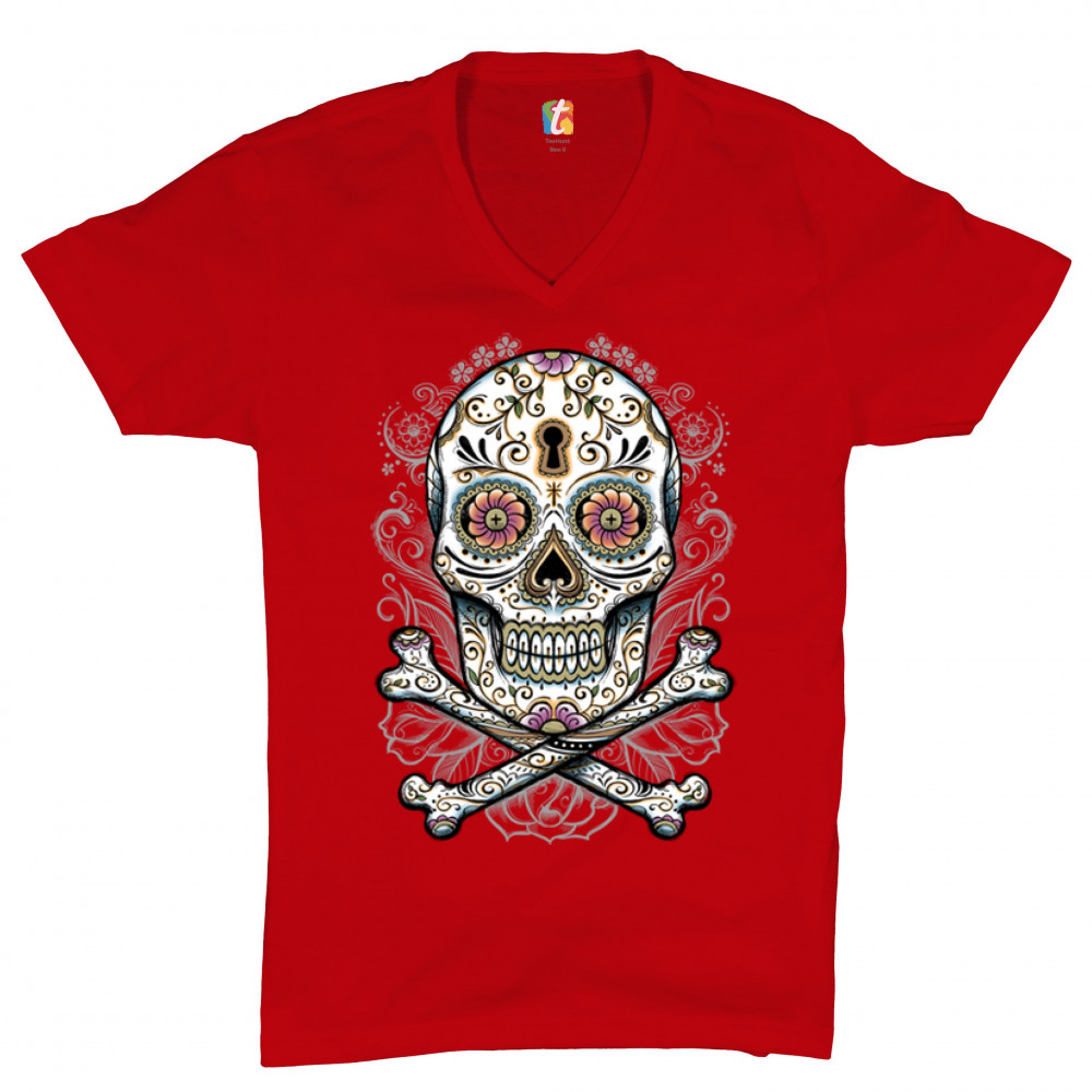 CALAVERA SUGAR SKULL v-neck t-shirt mexican day of the dead dia de muertos tee red
