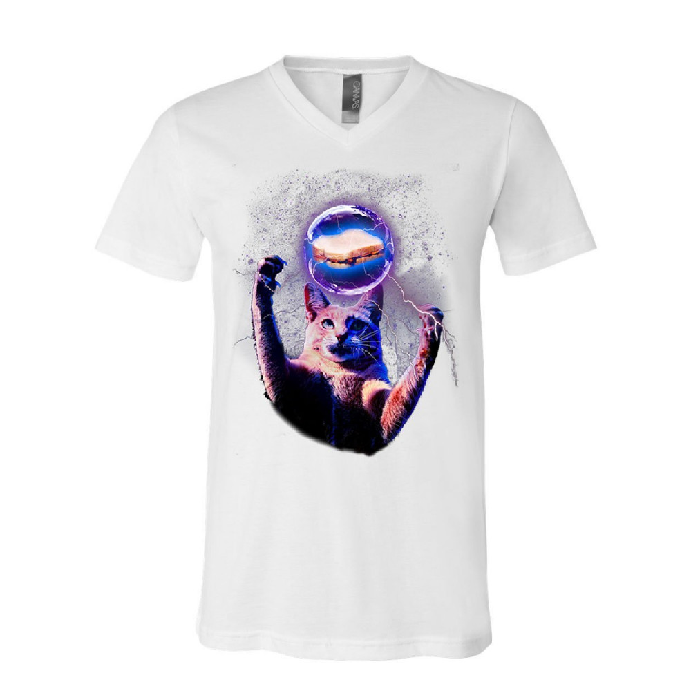 CAT CATCHING A PB&J cat catching a sandwich v-neck t-shirt plasma ball kitty kitten weird tee white