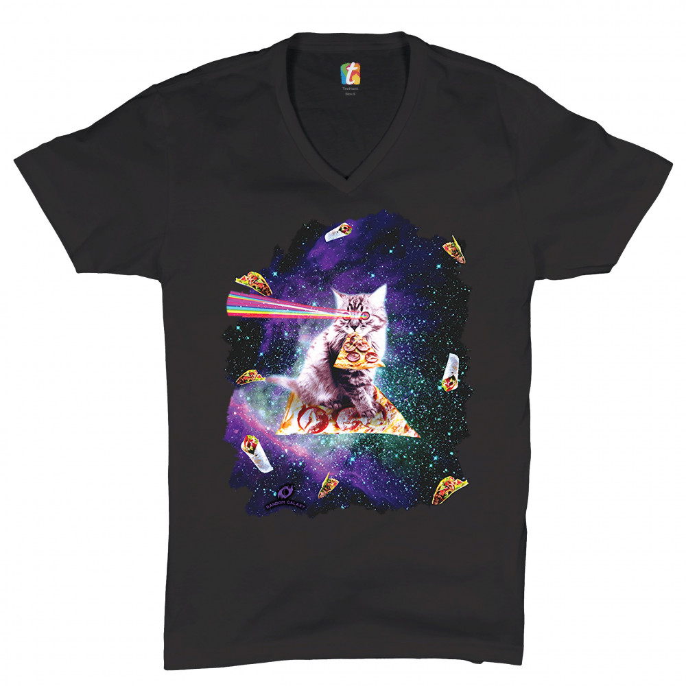 A print featuring a cat flying through space on a slice of pizza holding another slice in it's mouth while firing rainbow lasers from it's eyes. The cat is surrounded by burritos and shawarmas. A great choice for anyone who is into cats, space and weird s