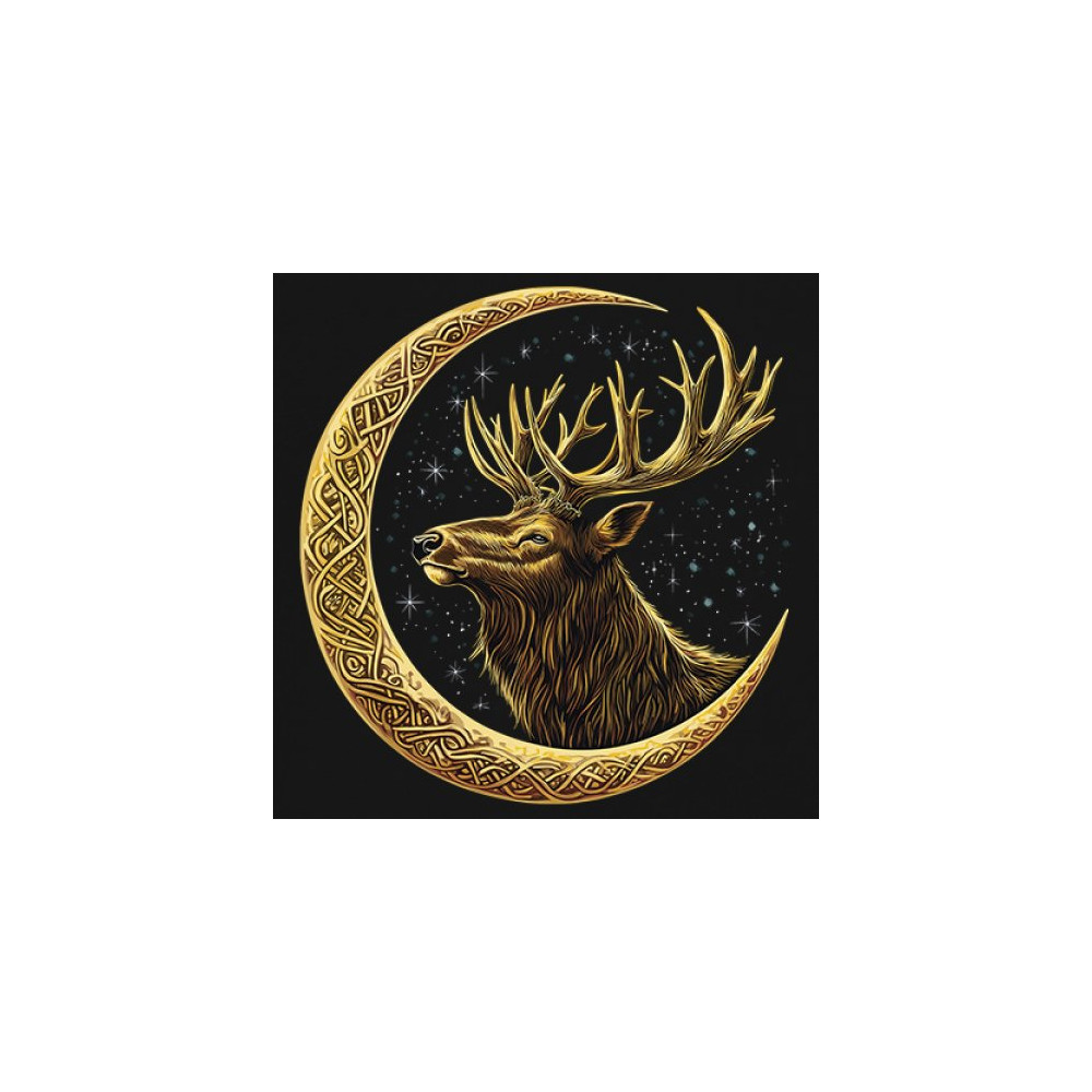 A majestic stag with bold antlers is framed by a glowing golden Celtic moon, set against a mystical night sky. This powerful image symbolizes strength, leadership, and spiritual connection to the forest. Perfect for fantasy fans, spiritual seekers, hunters, or anyone who honors nature, tribal themes, and cosmic symbolism.