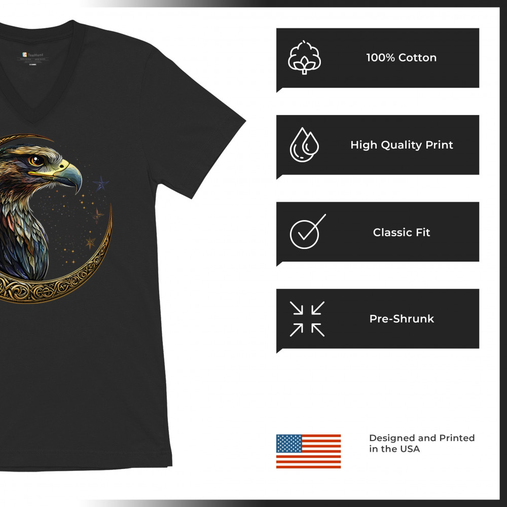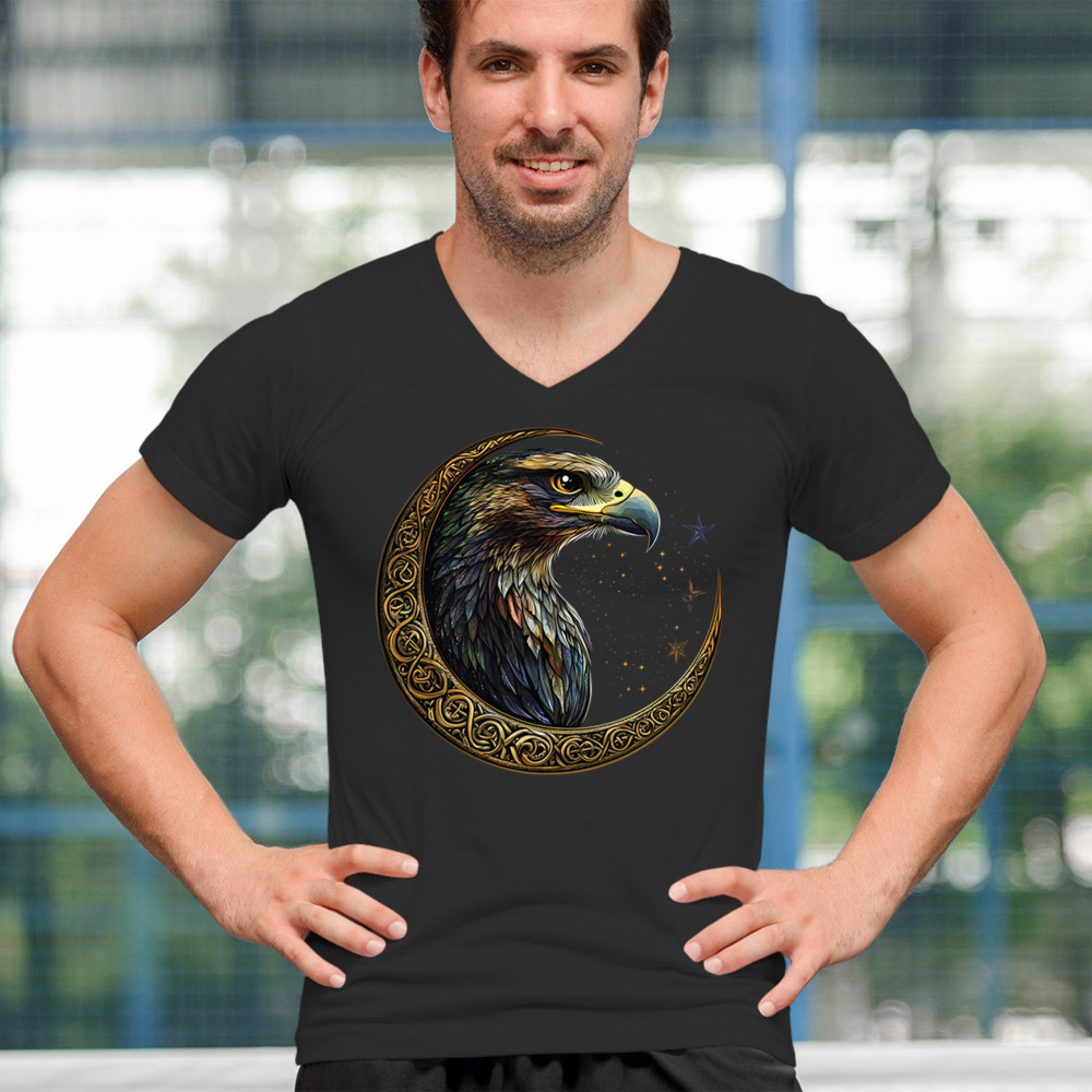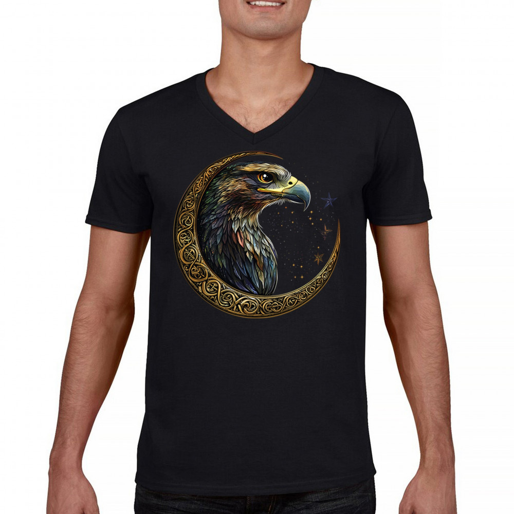 A beautifully detailed eagle with vibrant feathers is framed by a golden Celtic crescent moon and surrounded by a starry cosmic sky. This striking design represents freedom, spiritual power, and the mystery of the skies. Perfect for patriots, bird lovers, and those who connect with nature, tribal symbolism, and celestial art.