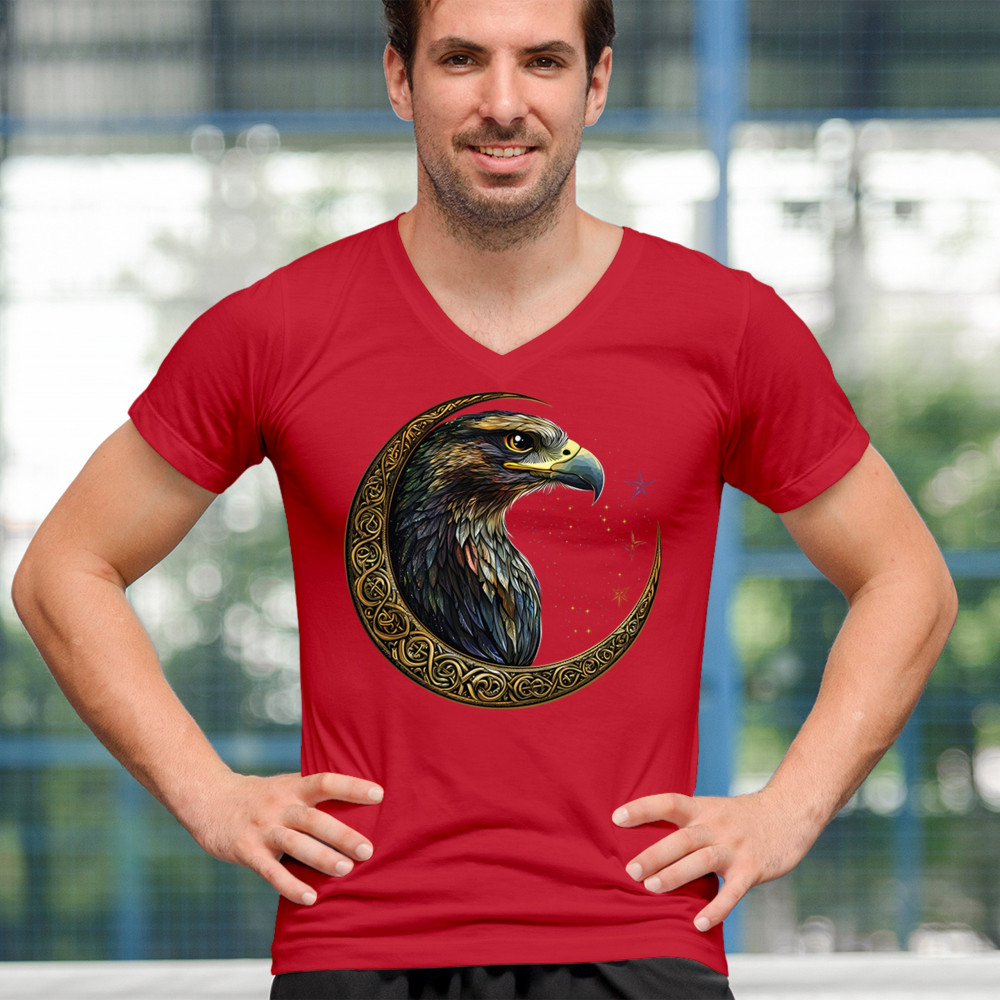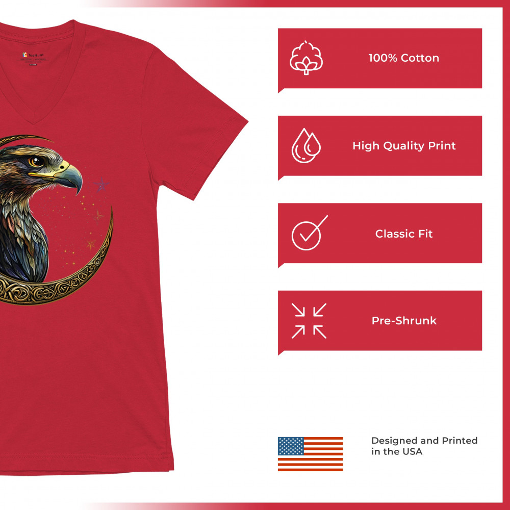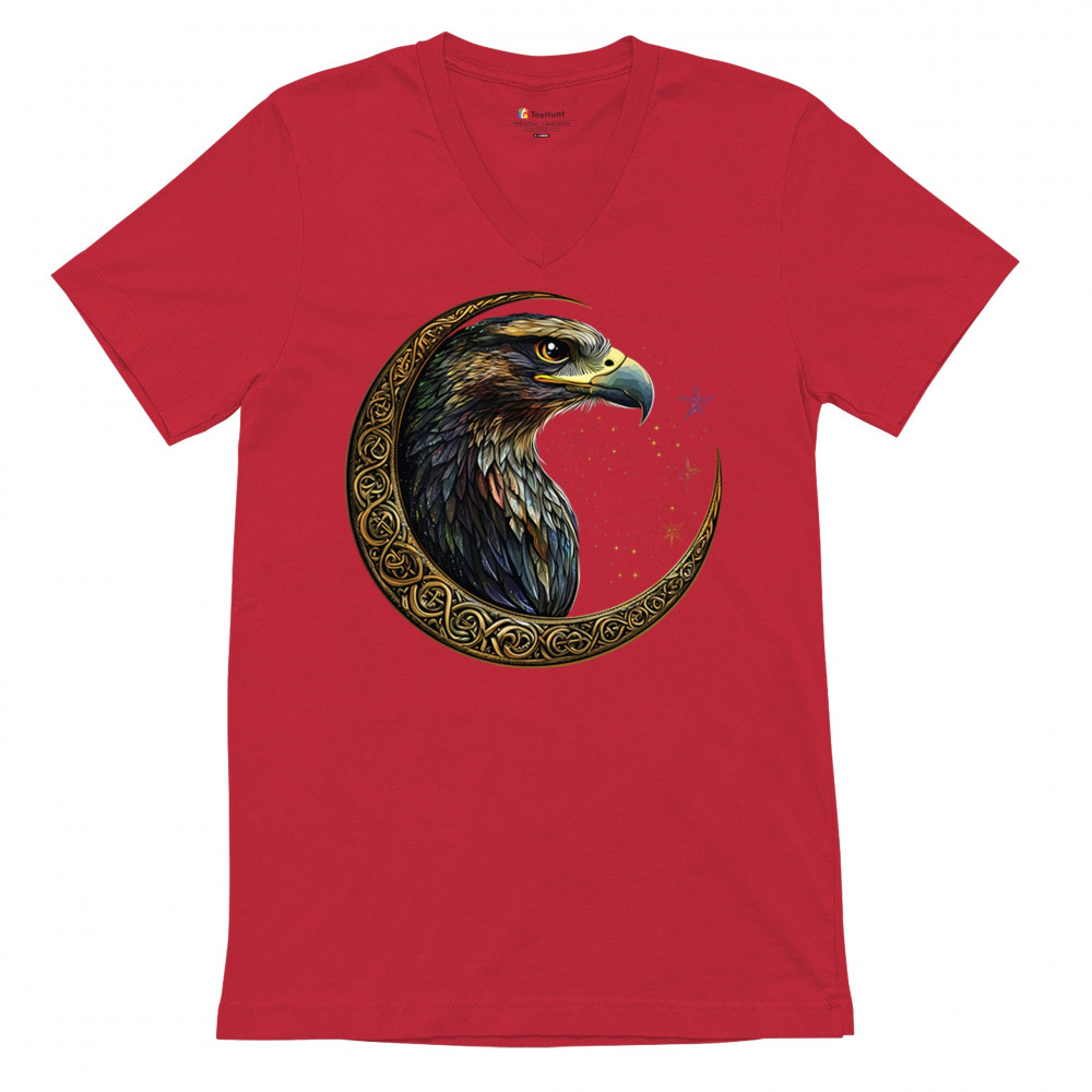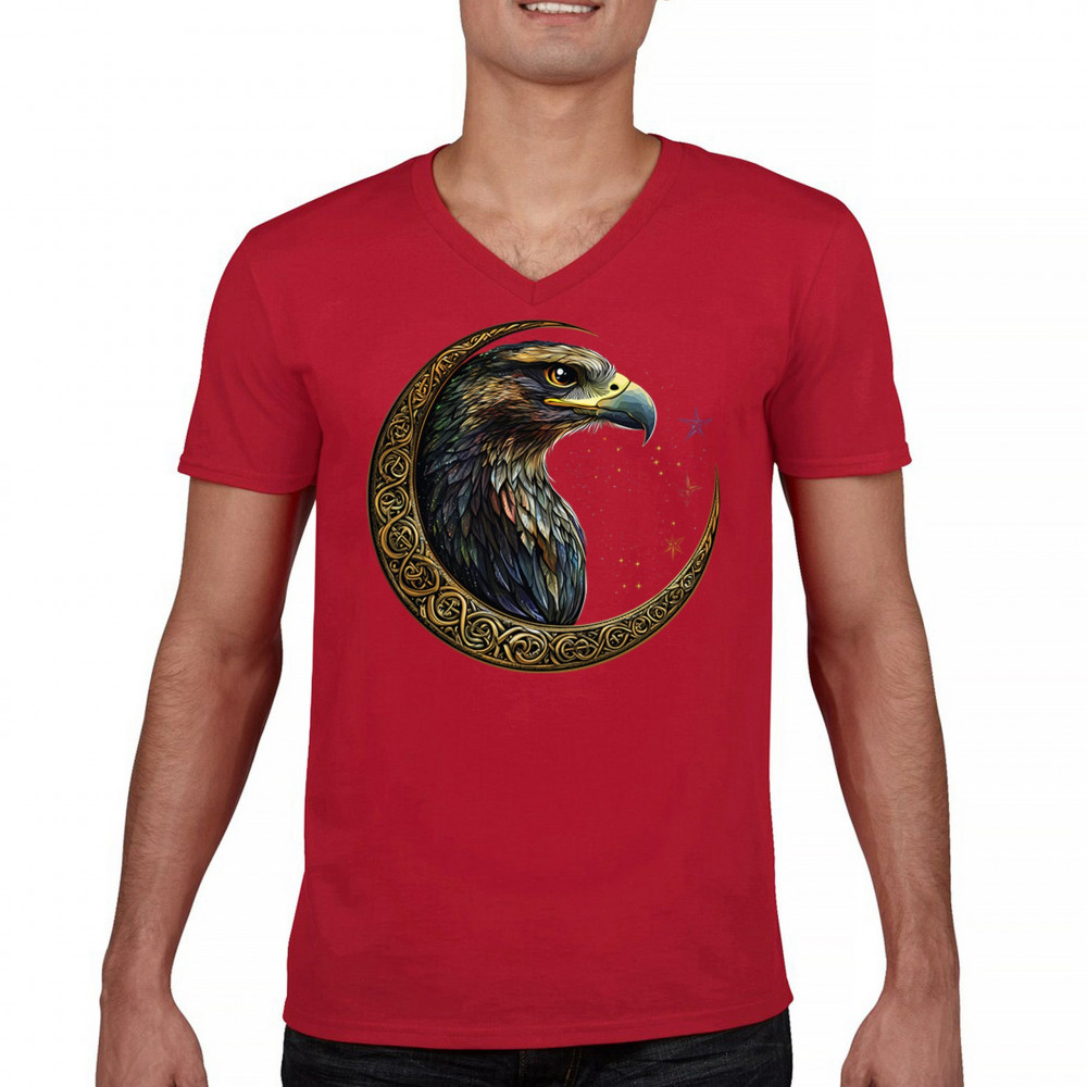 A beautifully detailed eagle with vibrant feathers is framed by a golden Celtic crescent moon and surrounded by a starry cosmic sky. This striking design represents freedom, spiritual power, and the mystery of the skies. Perfect for patriots, bird lovers, and those who connect with nature, tribal symbolism, and celestial art.