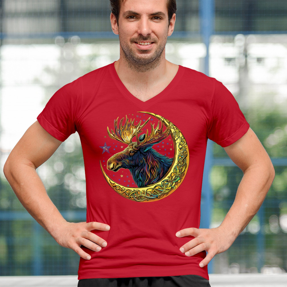 This vibrant moose design blends tribal art and fantasy energy with a golden Celtic crescent moon. Cosmic fur, radiant antlers, and a star-speckled sky make this image a symbol of strength, natural wisdom, and mysticism. Ideal for druids, hunters, fantasy fans, or spirit animal seekers connected to the forest and celestial realm.