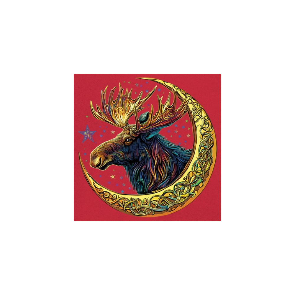 Mystical moose in gold Celtic crescent moon design—symbolizes strength, nature wisdom, and cosmic spirit for fantasy lovers and woodland fans.