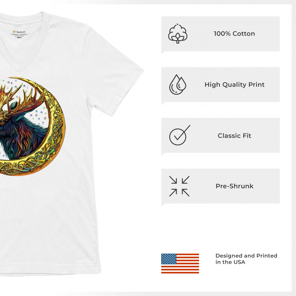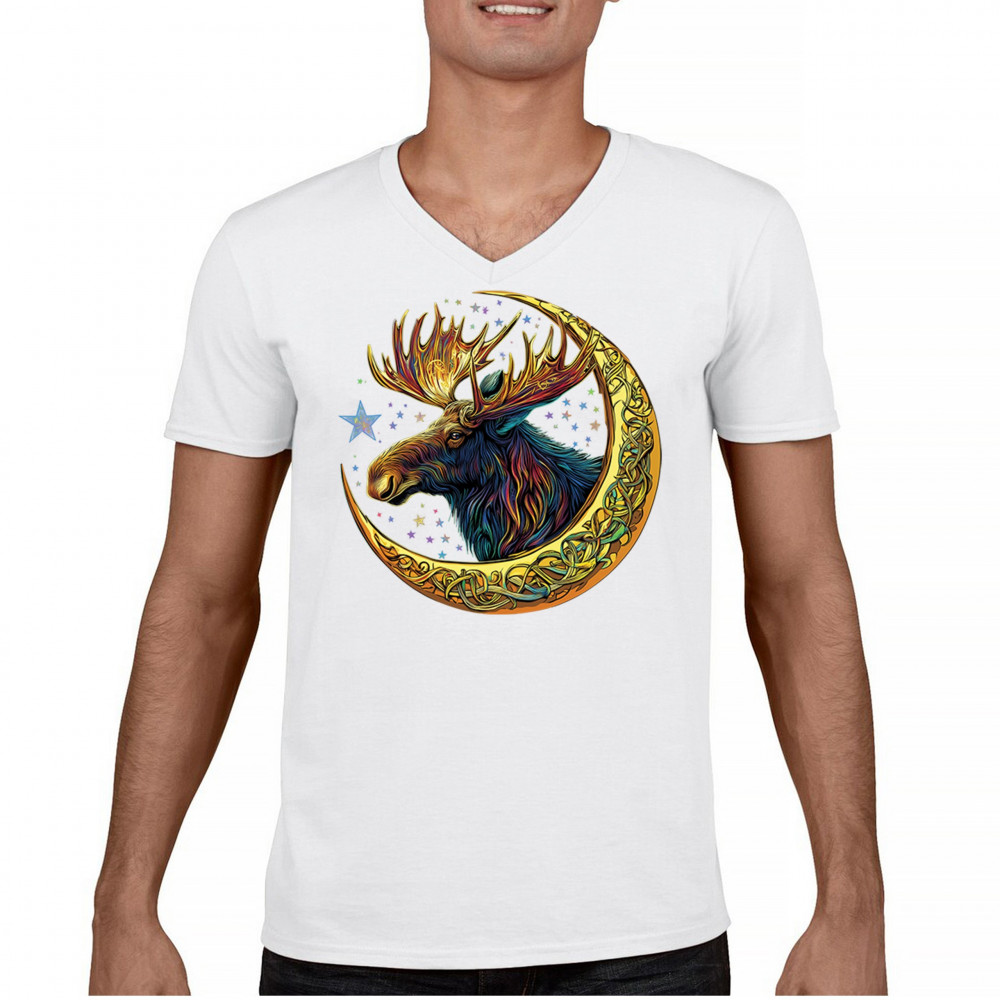 Mystical moose in gold Celtic crescent moon design—symbolizes strength, nature wisdom, and cosmic spirit for fantasy lovers and woodland fans.