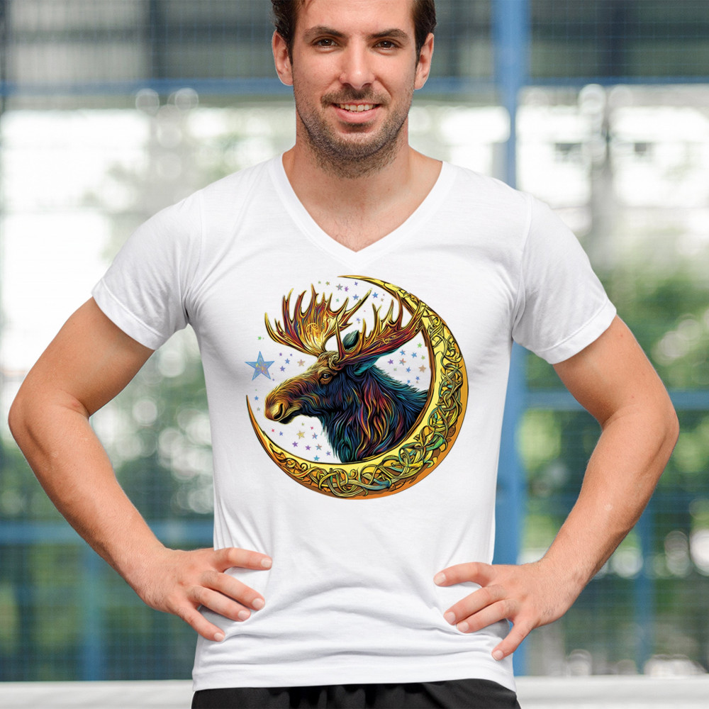 This vibrant moose design blends tribal art and fantasy energy with a golden Celtic crescent moon. Cosmic fur, radiant antlers, and a star-speckled sky make this image a symbol of strength, natural wisdom, and mysticism. Ideal for druids, hunters, fantasy fans, or spirit animal seekers connected to the forest and celestial realm.