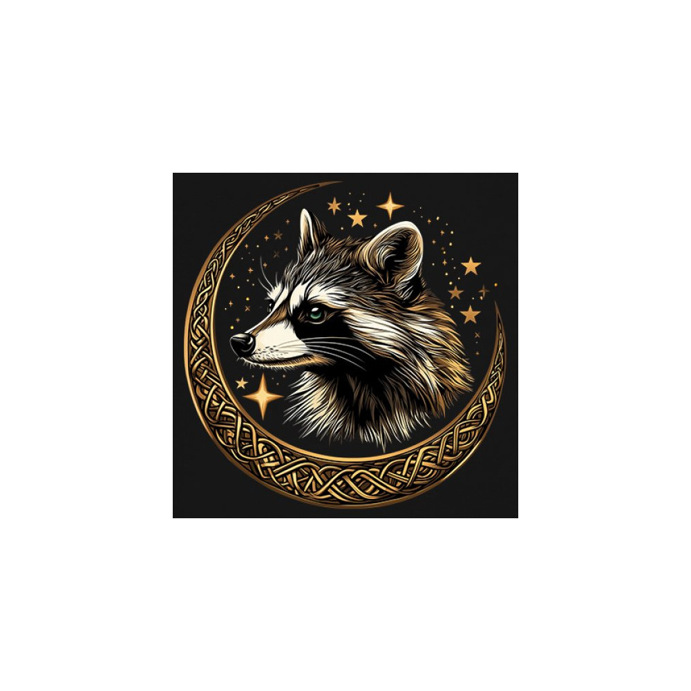 Cosmic raccoon design in Celtic moon. Symbol of adaptability, mystery, and spiritual intelligence. A perfect gift for wild and curious souls.