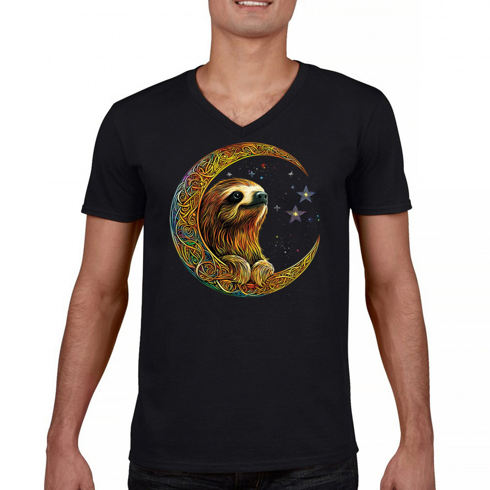 Peaceful sloth in Celtic crescent moon with cosmic sky. Symbol of mindfulness, rest, and intentional living. A calm, magical fantasy design.