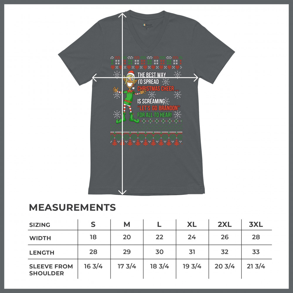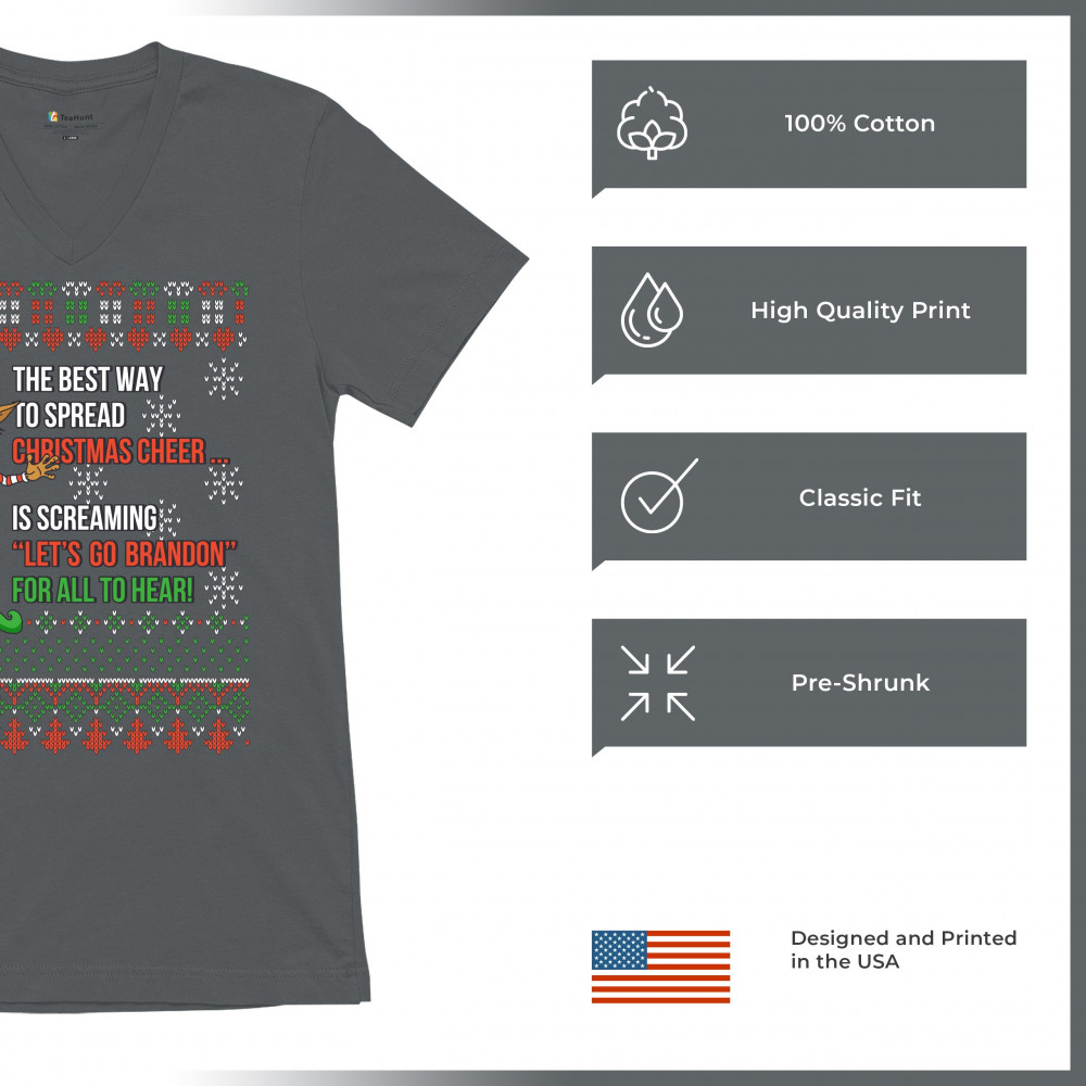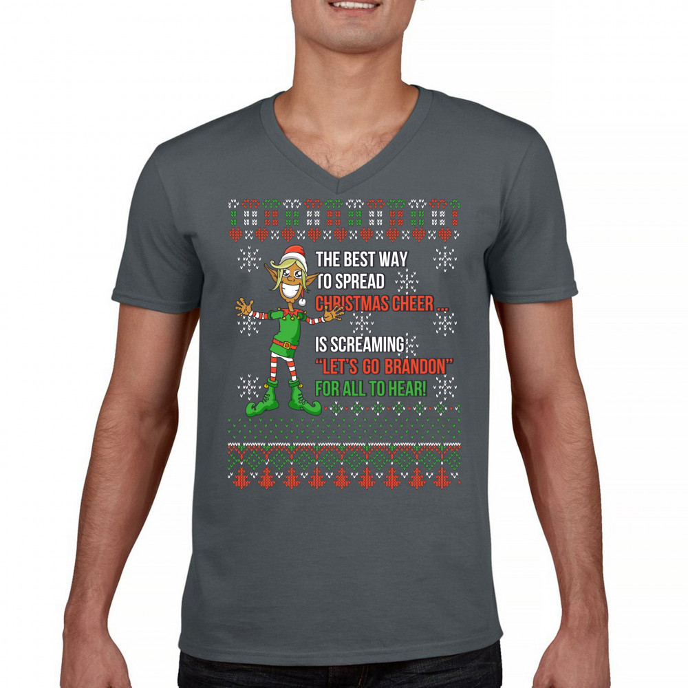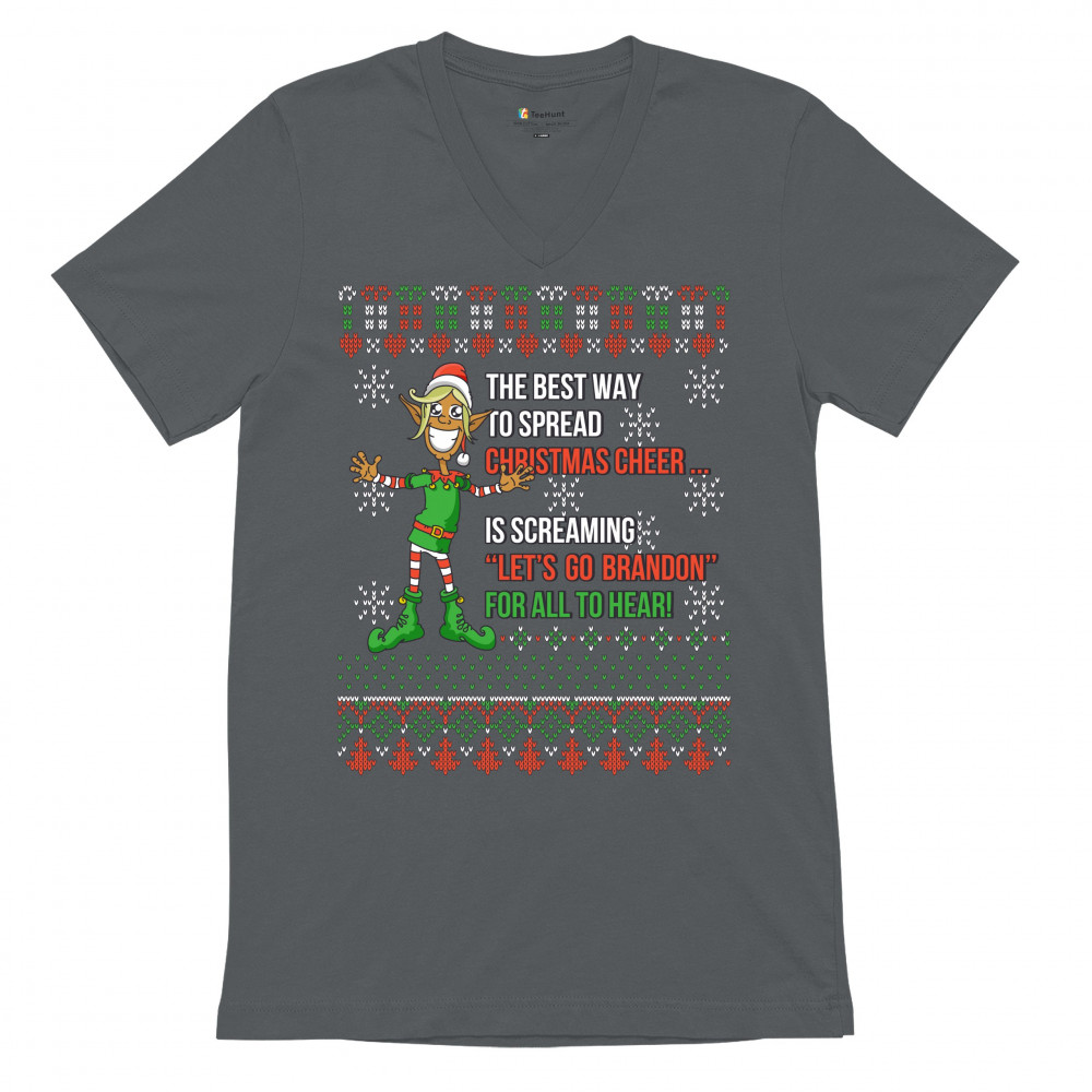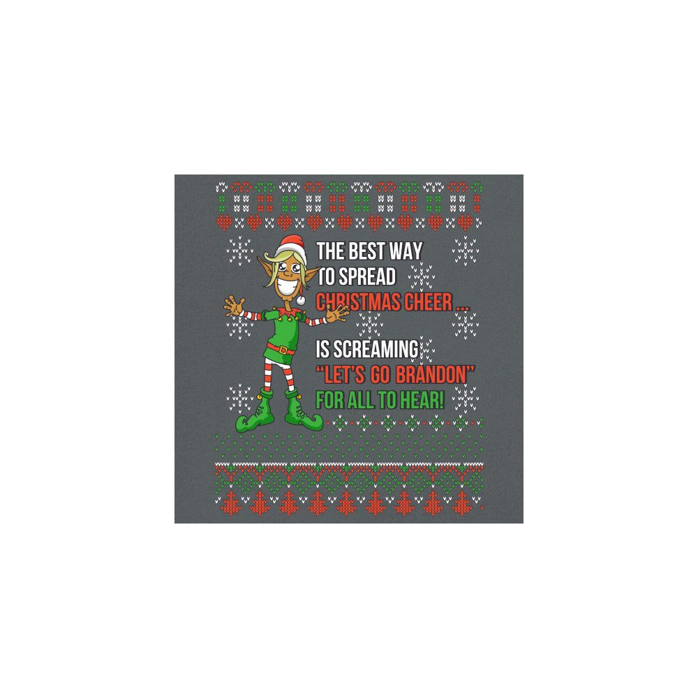 A funny print saying: "The Best Way to Spread Christmas Cheer Is Screaming Let's Go Brandon for All to Hear" and featuring a smiling elf. The print is decorated as a Christmas ugly Sweater. A great choice to wear for a Christmas or New Year's Eve party an