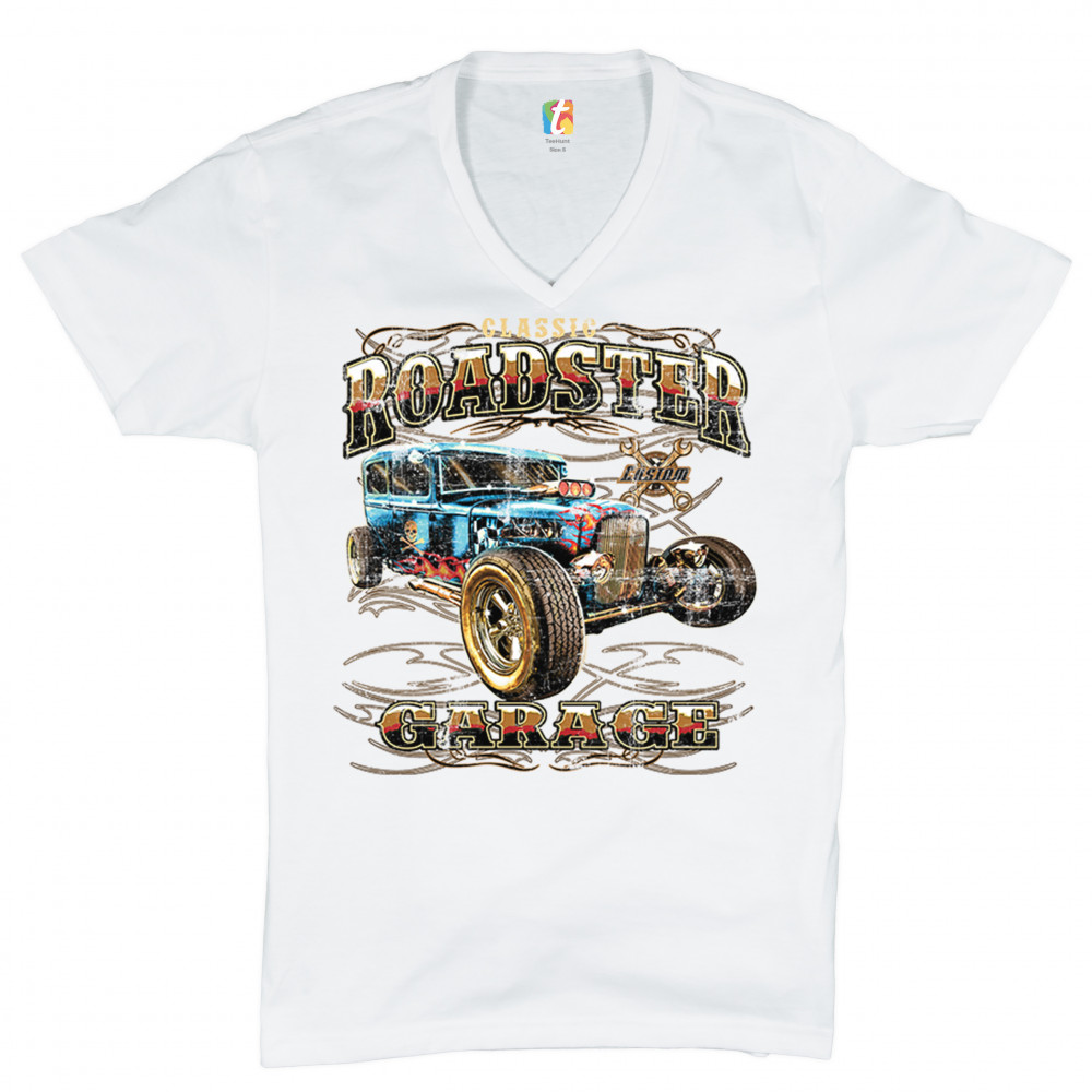 A print featuring a vintage-looking rat rod with flames and a skull with crossbones painted on it's side. "Classic Roadster" is written in the top and "Garage" in the bottom of the print. In the background there is a sign with crossed wrenches which says "custom". Great for Route 66 and hot rod fans.