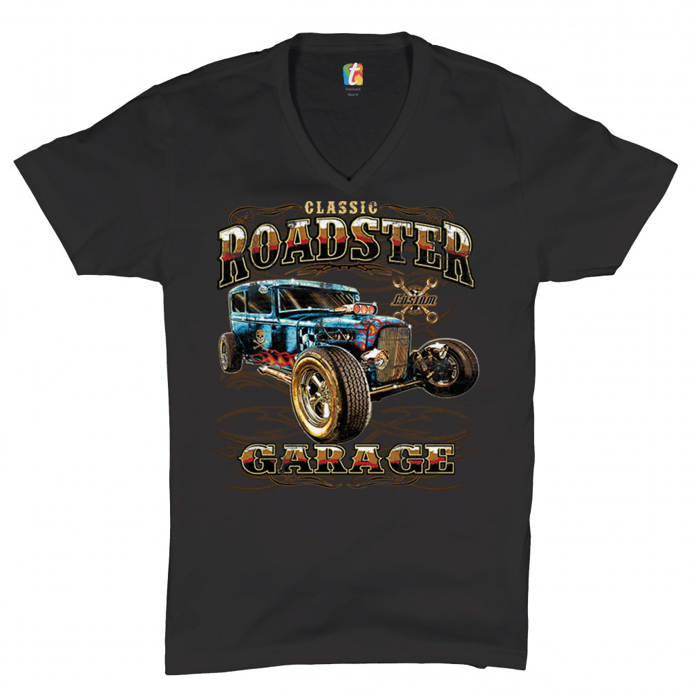 A print featuring a vintage-looking rat rod with flames and a skull with crossbones painted on it's side. "Classic Roadster" is written in the top and "Garage" in the bottom of the print. In the background there is a sign with crossed wrenches which says "custom". Great for Route 66 and hot rod fans.