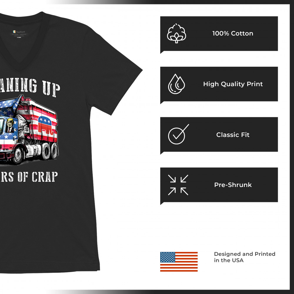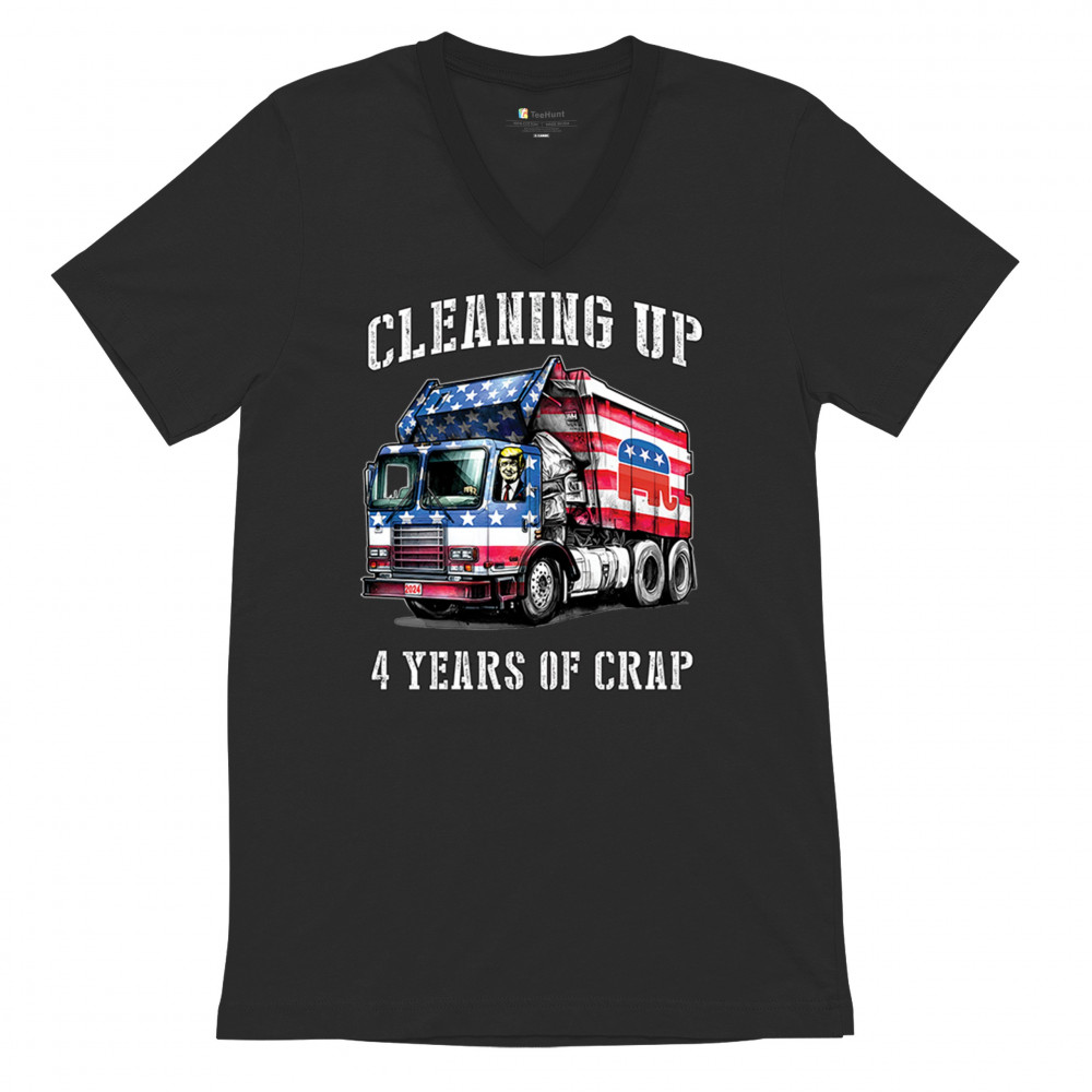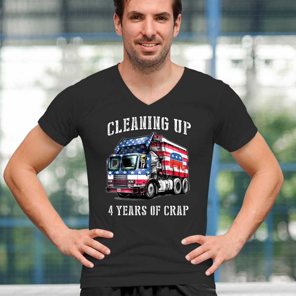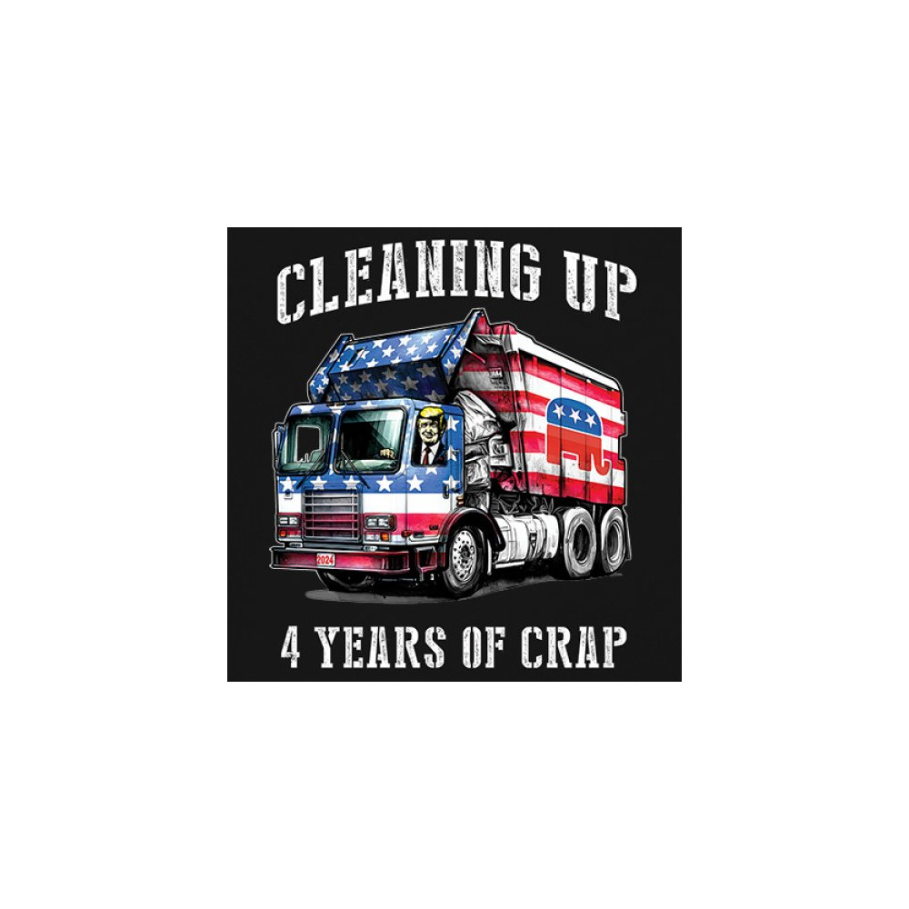 Bold "Cleaning Up 4 Years of Crap" design featuring Trump, the GOP, and the American flag. Perfect for proud conservatives and patriots.