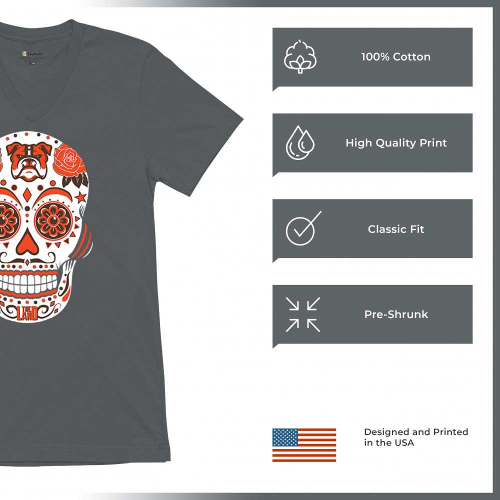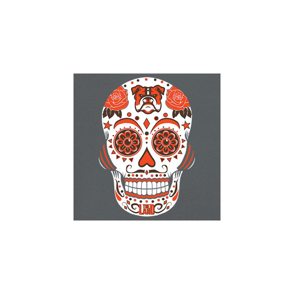 Cleveland Sugar Skull with Lake Erie pride, Rust Belt football grit, orange & brown tradition, playoff vibes, and Game Day passion.