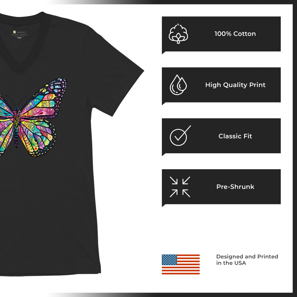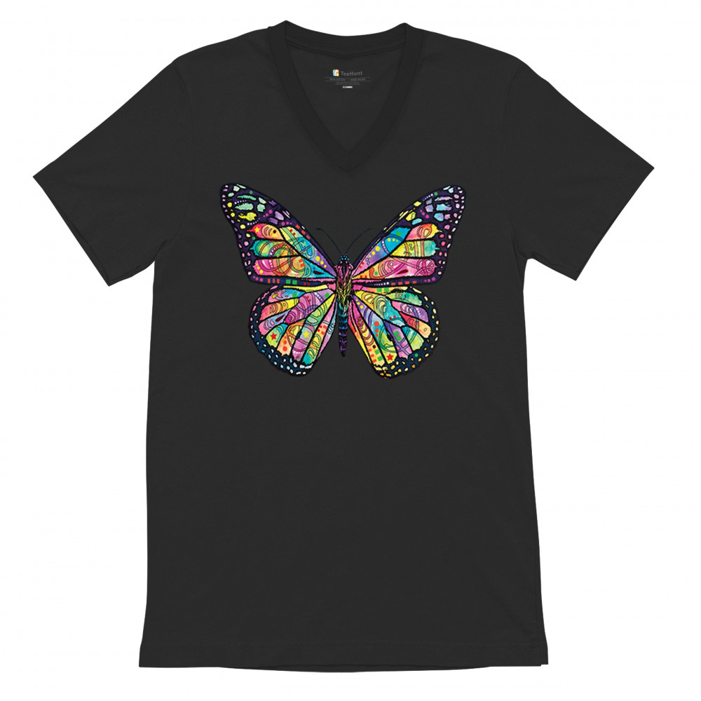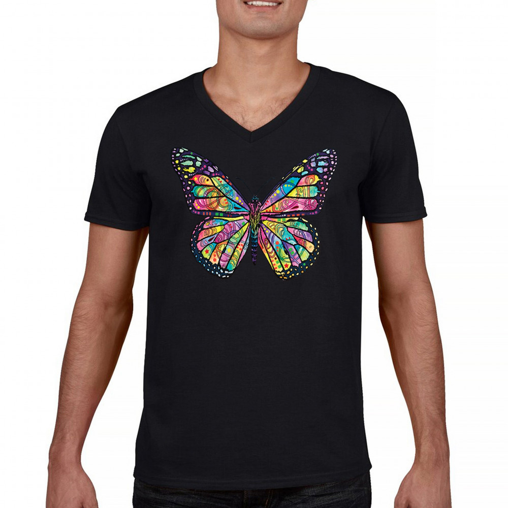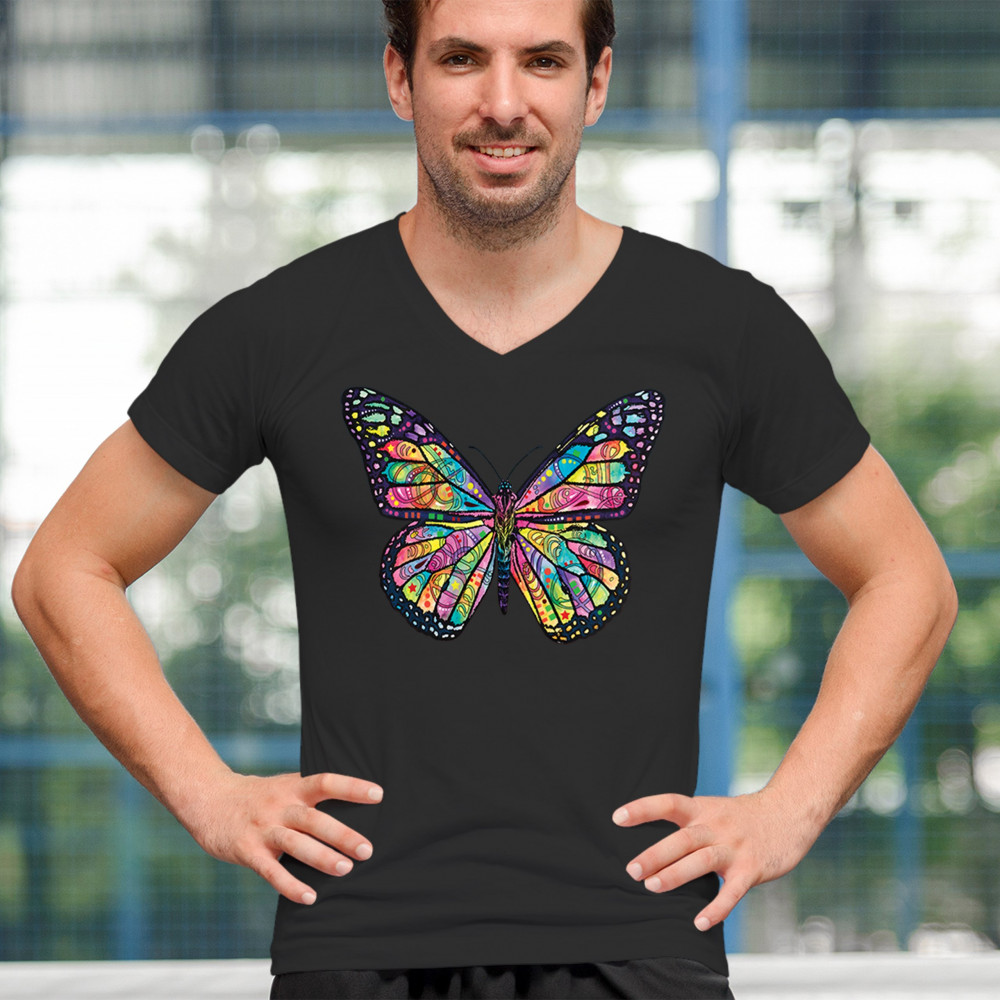 COLORFUL NEON BUTTERFLY v-neck t-shirt dean russo beautiful nature tee black