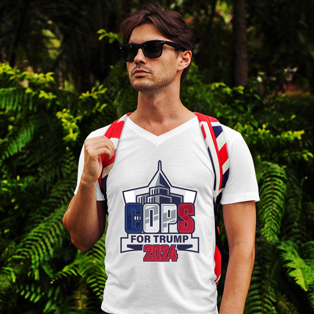 A political print saying "cops for Trump". In the background there is a badge with depiction of a city. A great choice to wear for a Trump rally or give as a gift to a Donald Trump supporter before 2024 presidential elections.