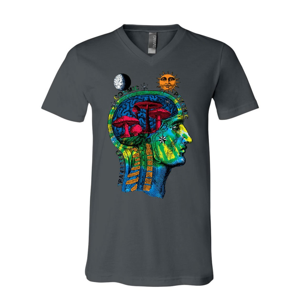 MUSHROOM HEAD cosmic psychic transcend v-neck t-shirt psychedelic trippy weird space tee charcoal