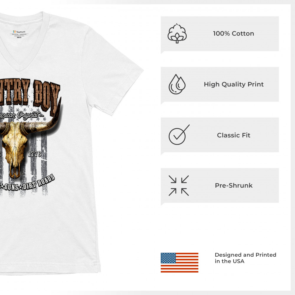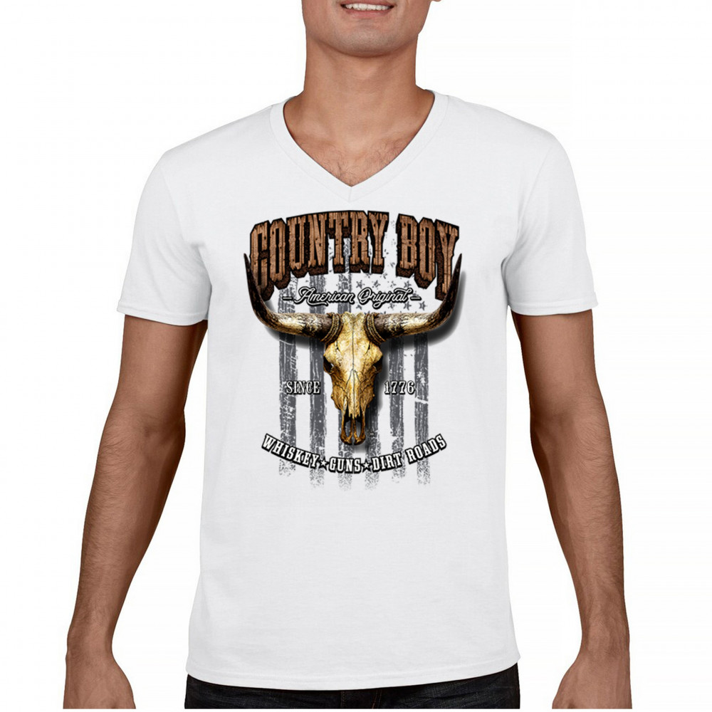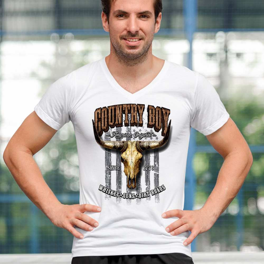 Country Boy – American Original. This bold western design captures the essence of southern living with a vintage bull skull, rustic lettering, and pride in whiskey, guns, and dirt roads. From 1776 to today, it honors the heritage of freedom-loving country men. Wear it to rodeos, bonfires, or muddy trails.