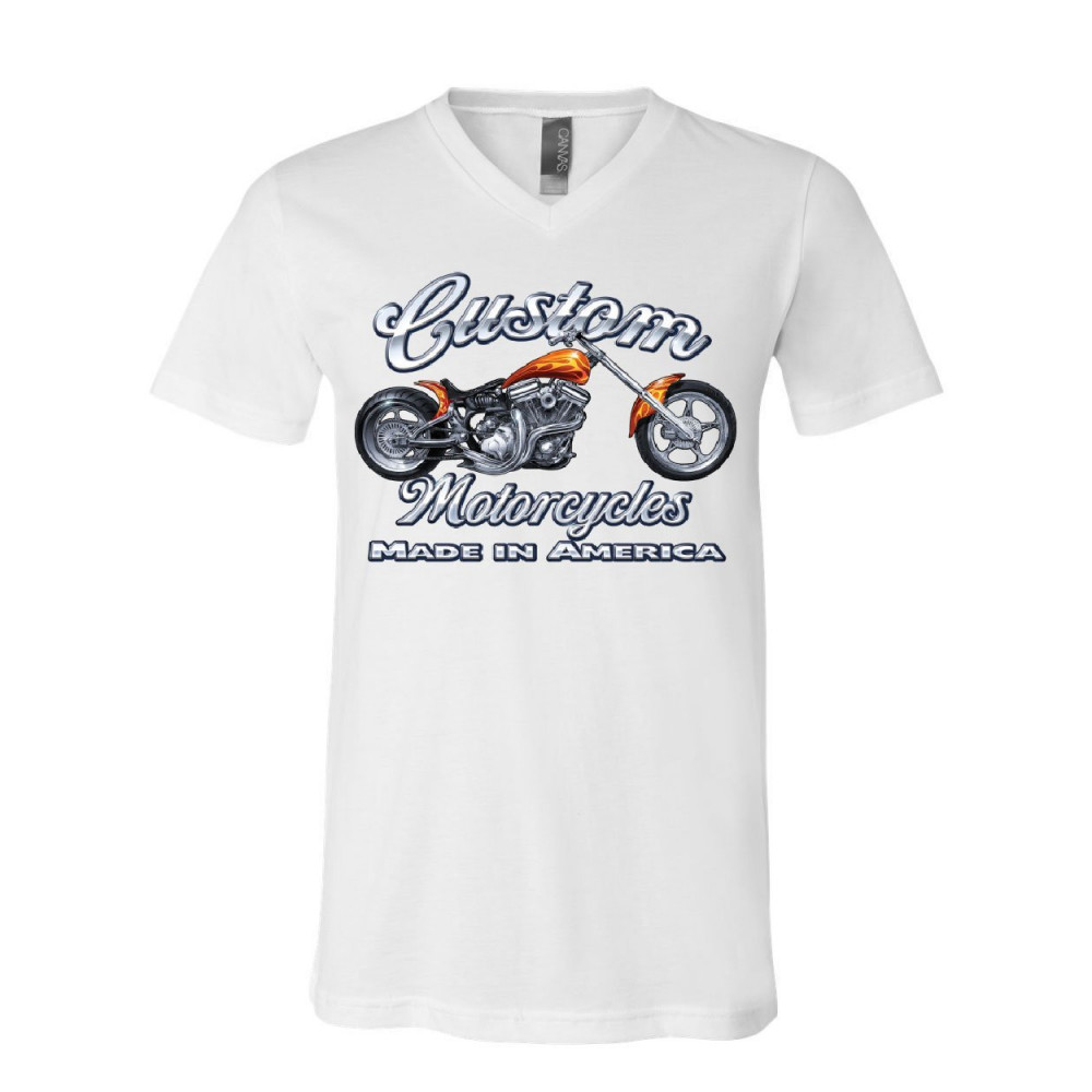 CUSTOM MOTORCYCLES v-neck t-shirt biker chopper american tradition usa tee white