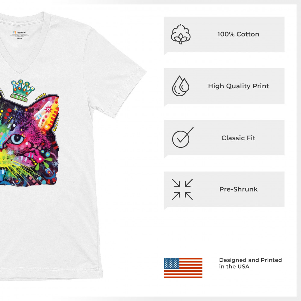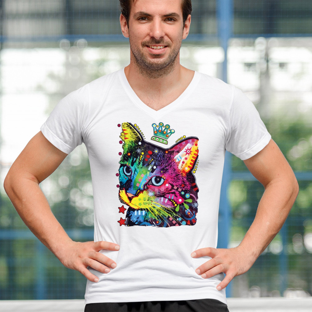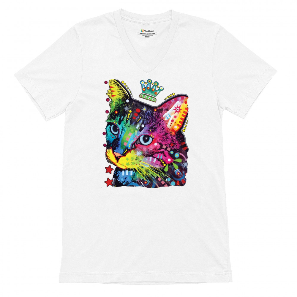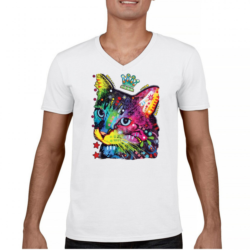 CUTE THINKING CROWNED CAT v-neck t-shirt dean russo colorful kitten tee white