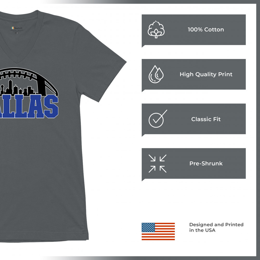 Show off your Dallas pride with a bold football-themed design featuring the city's skyline. Perfect for game days, tailgates, and passionate fans.