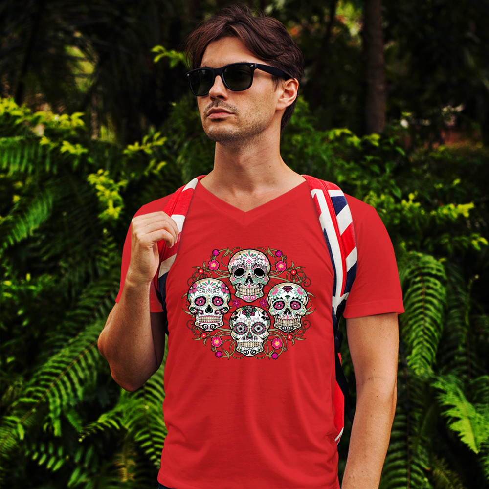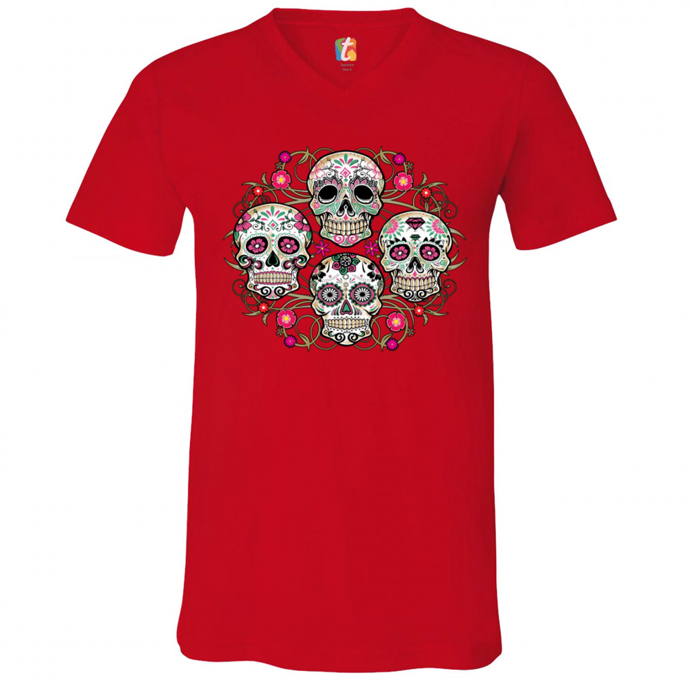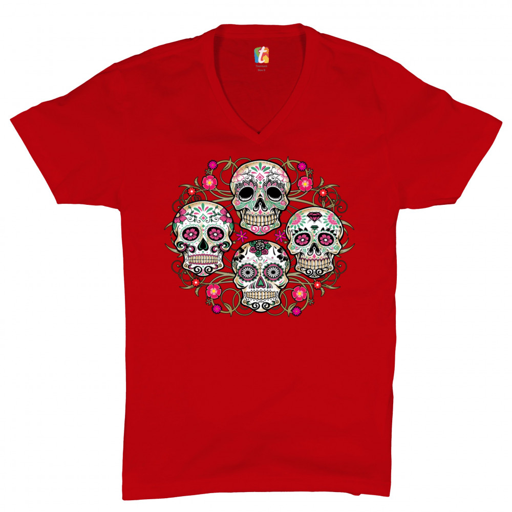 DAY OF THE DEAD FLORAL SUGAR SKULLS v-neck t-shirt dia de los muertos tee red