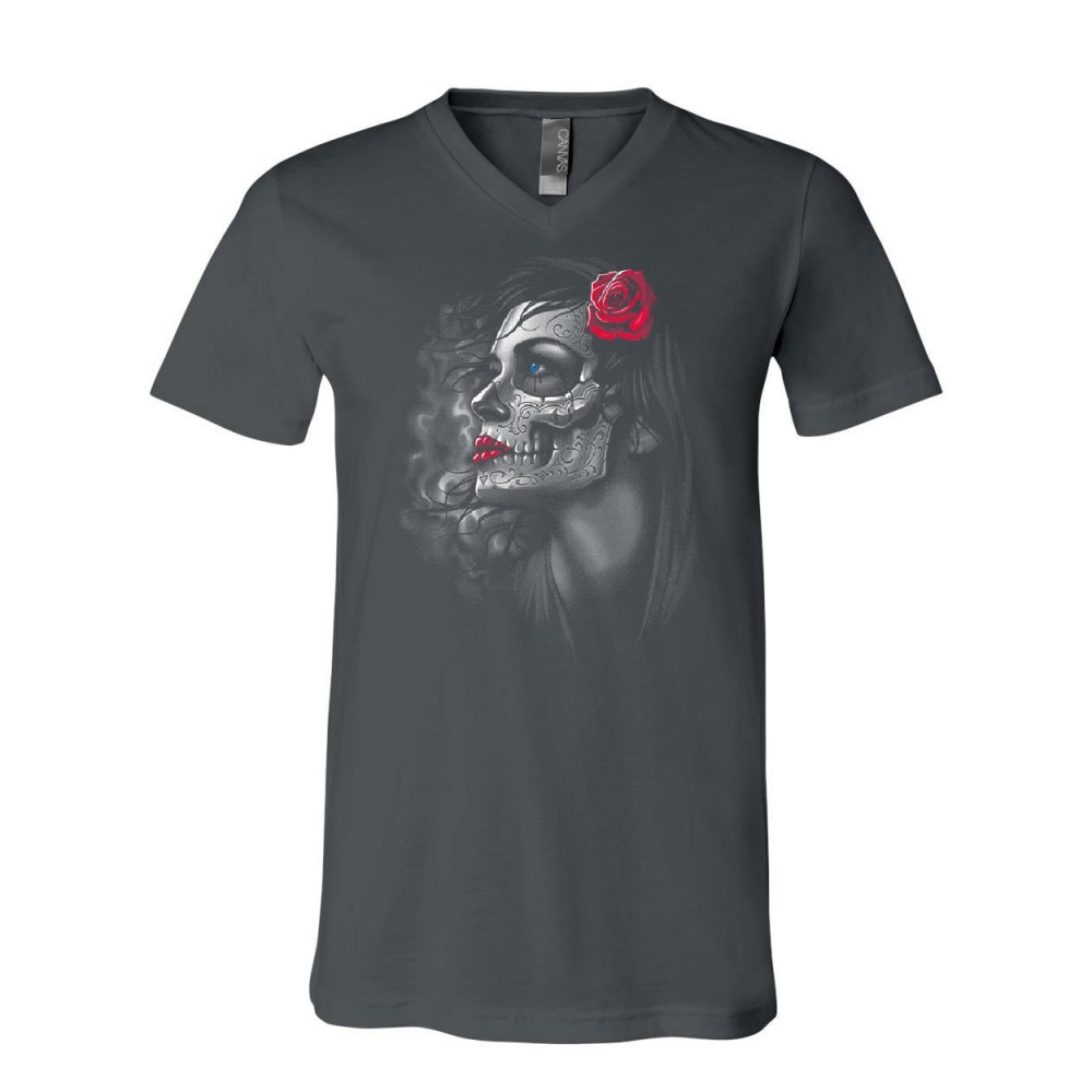 DAY OF THE DEAD GIRL v-neck t-shirt skull face dia de los muertos roses tee charcoal