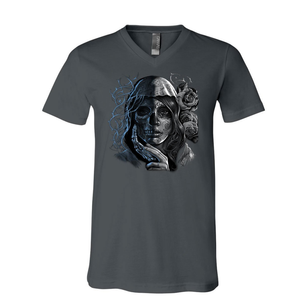 DEAD GIRL WITH ROSES v-neck t-shirt sugar skull face day of the dead tee charcoal