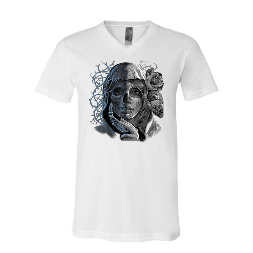 DEAD GIRL WITH ROSES v-neck t-shirt sugar skull face day of the dead tee white
