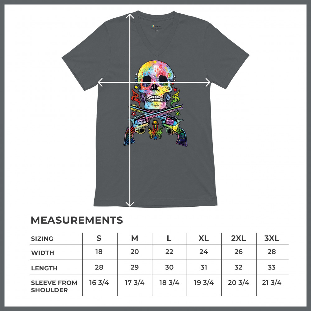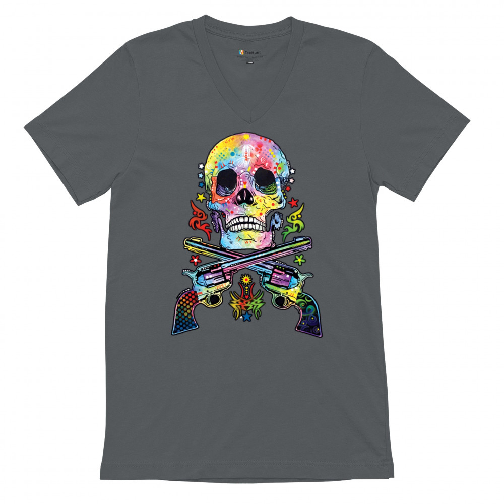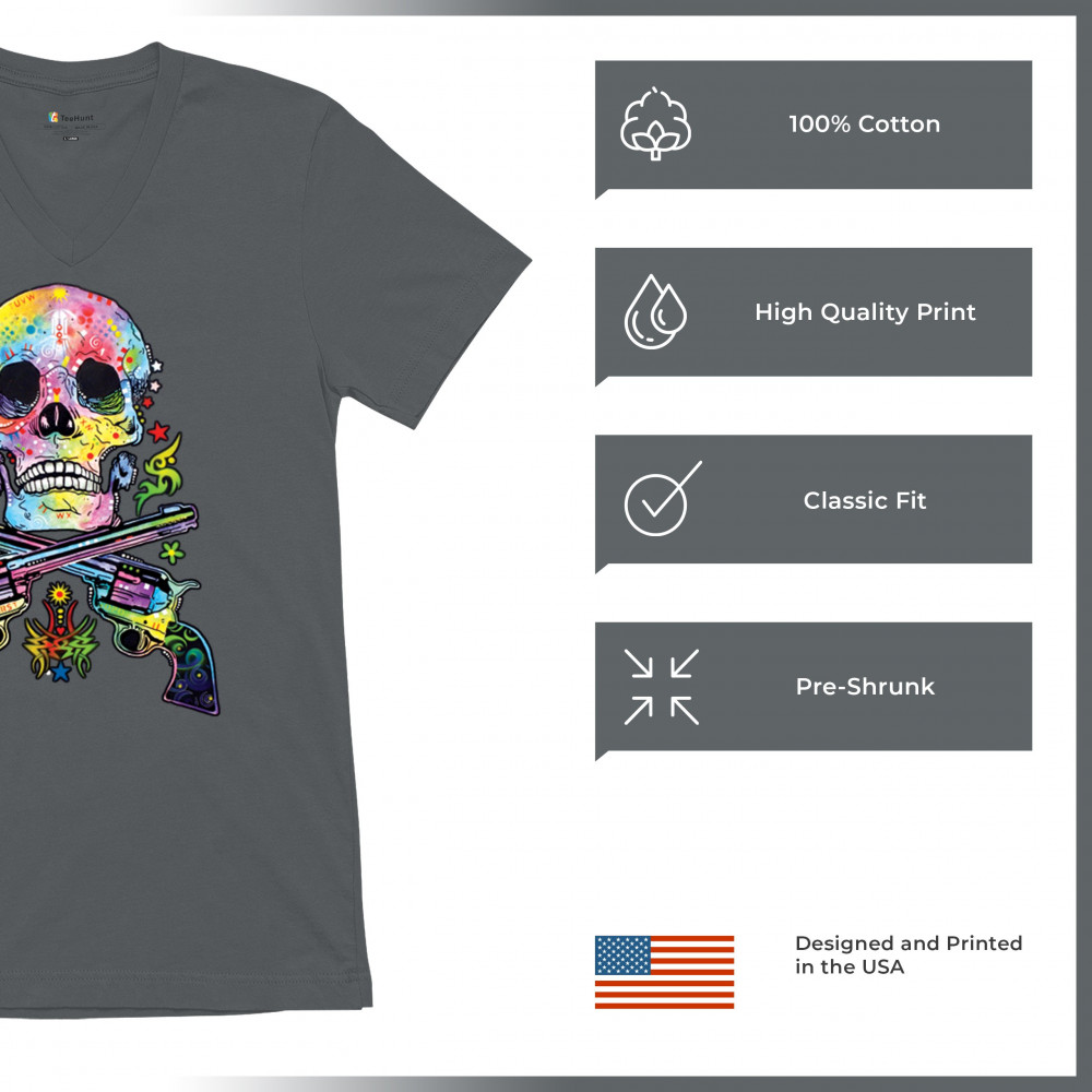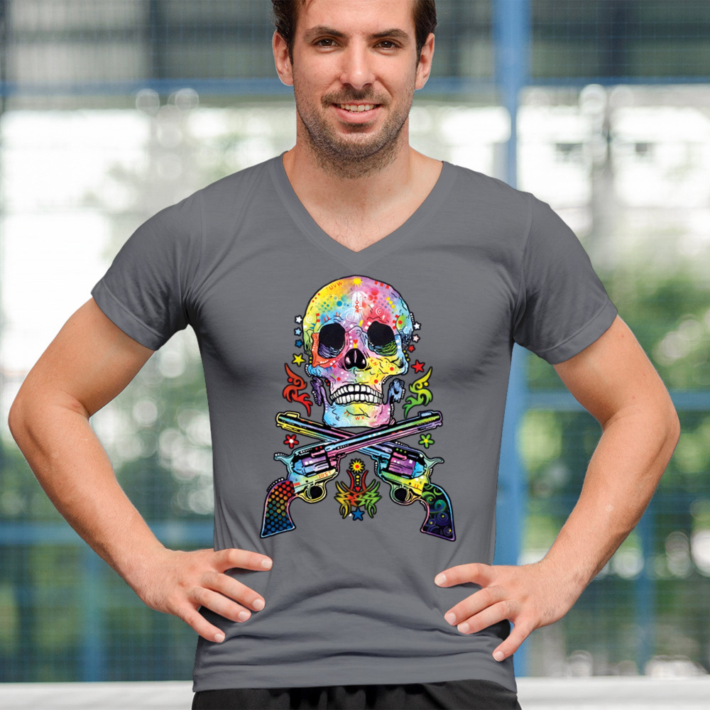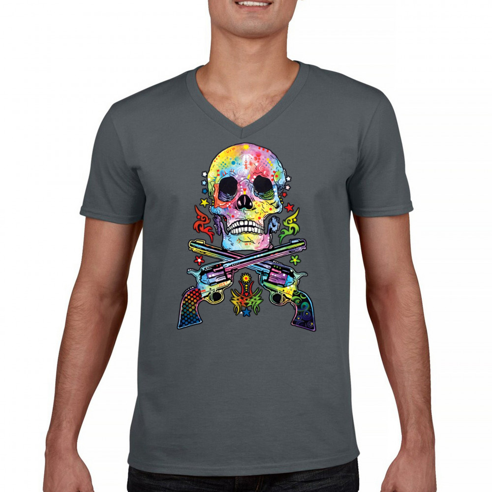 DEAN RUSSO ART SKULL AND GUNS v-neck t-shirt colorful 2nd amendment tee charcoal