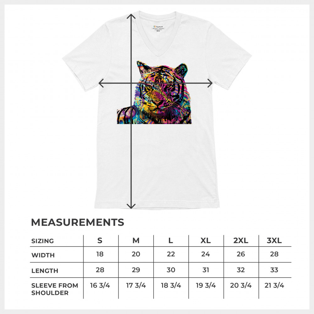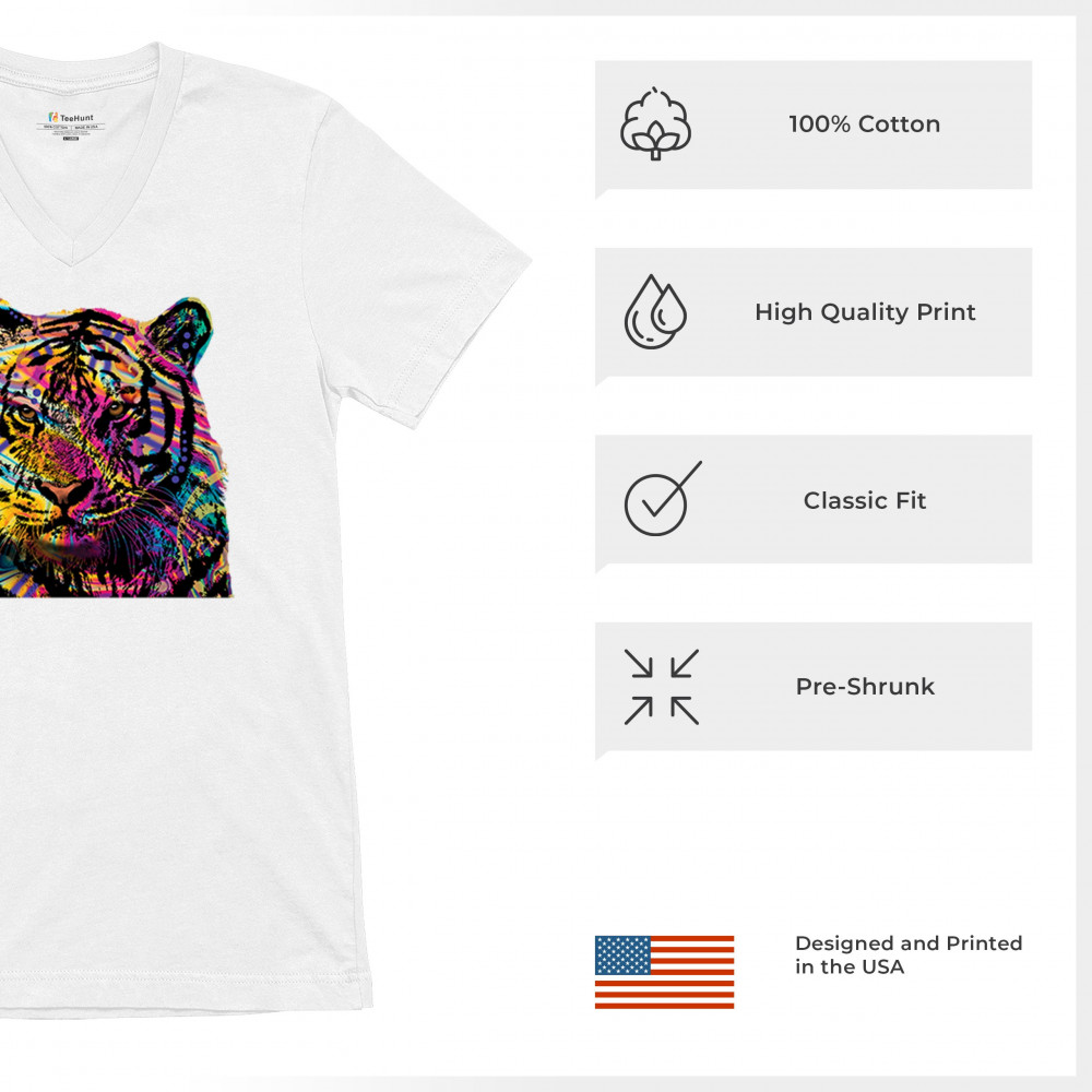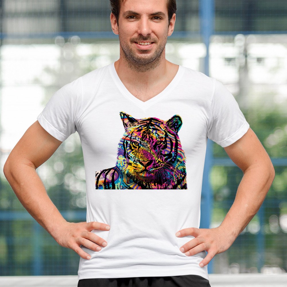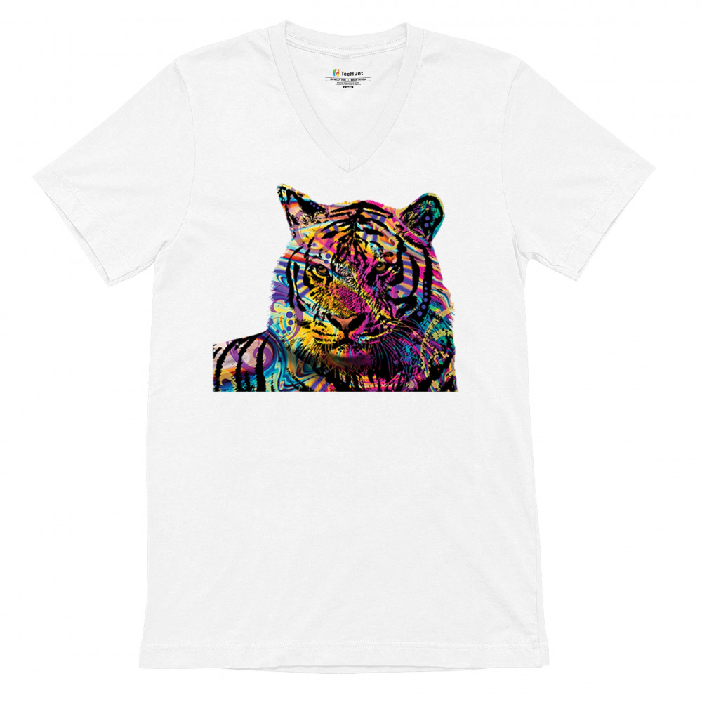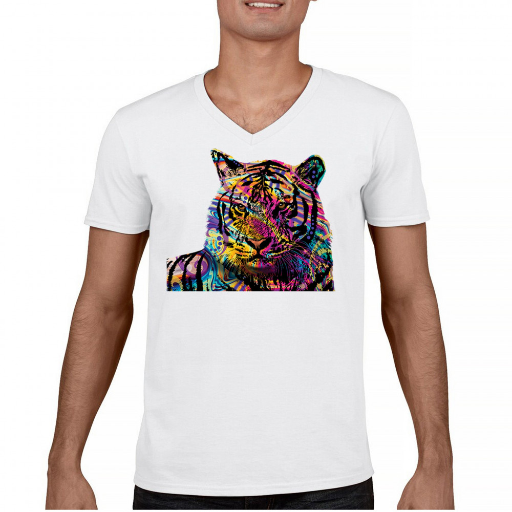 DEAN RUSSO COLORFUL NEON SIBERIAN TIGER v-neck t-shirt wild big cat tee white