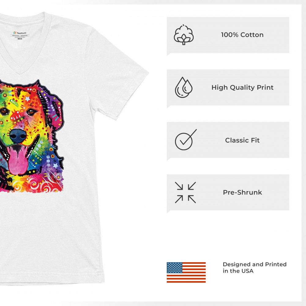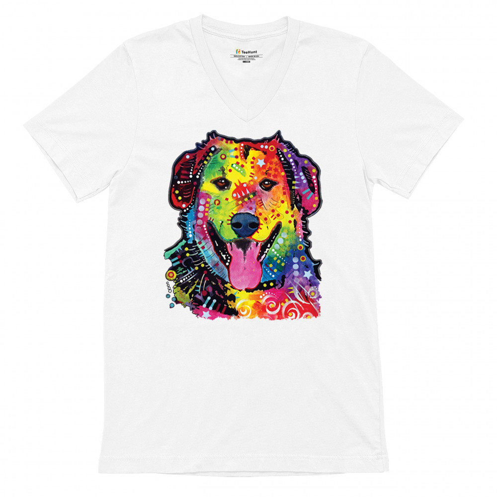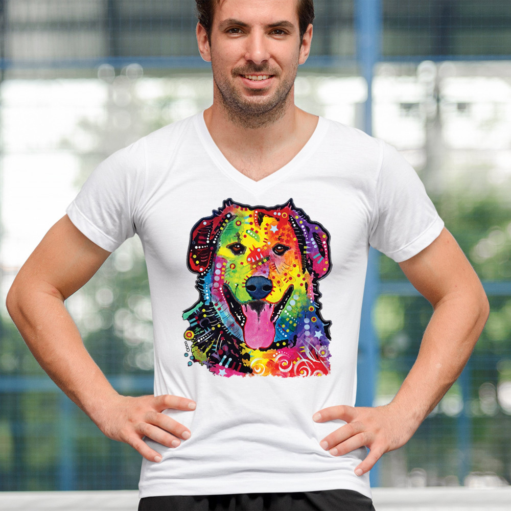 DEAN RUSSO CUTE NEON DOG v-neck t-shirt rescue adopt a pet colorful pet tee white