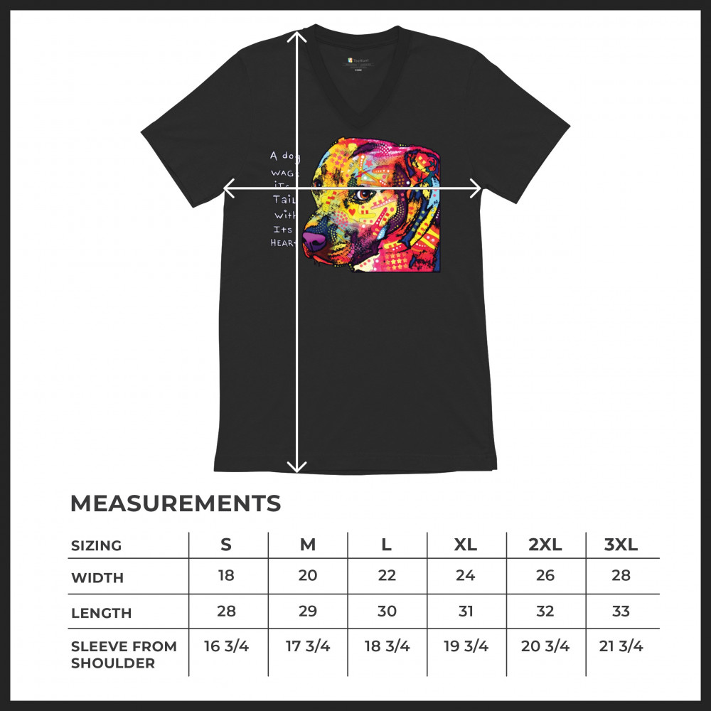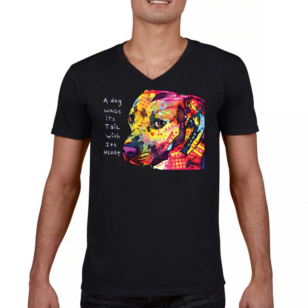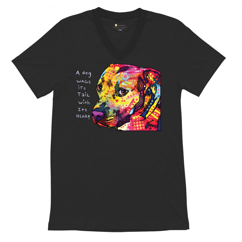 DEAN RUSSO PIT BULL v-neck t-shirt dog wags its tail with its heart tee black