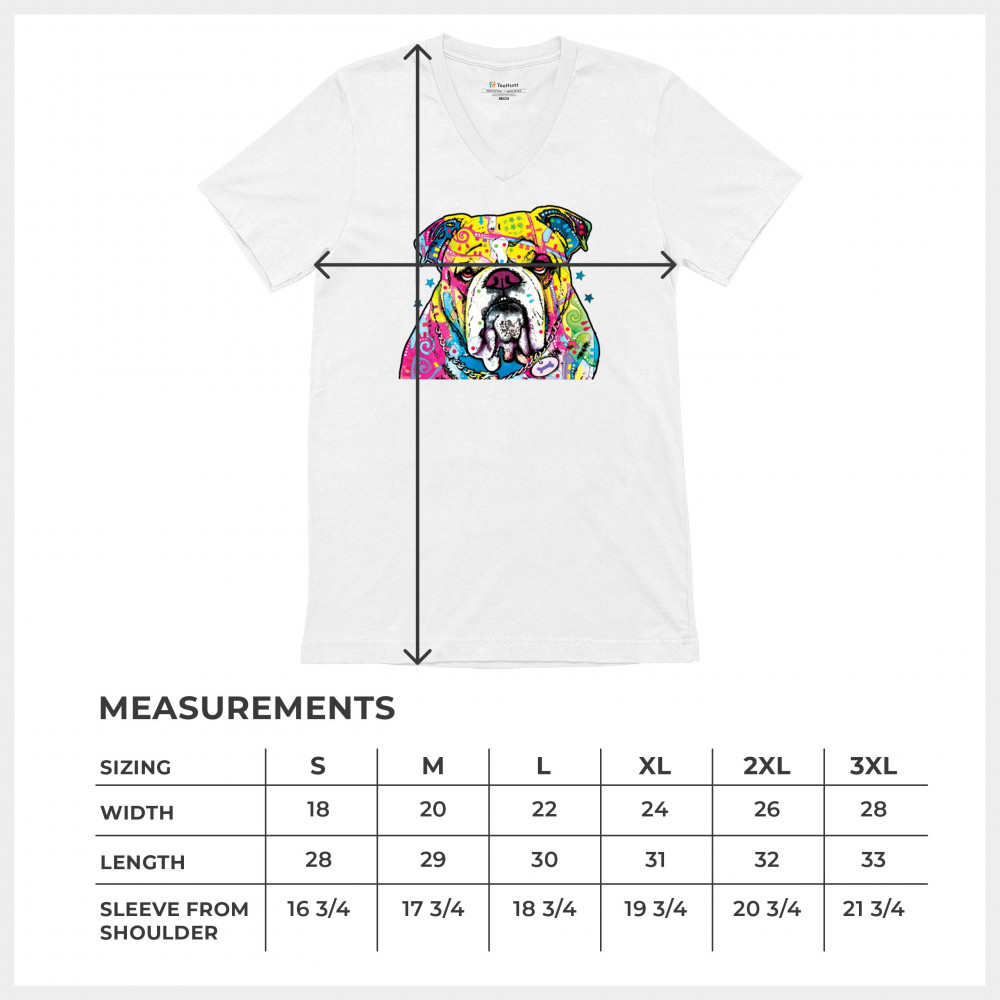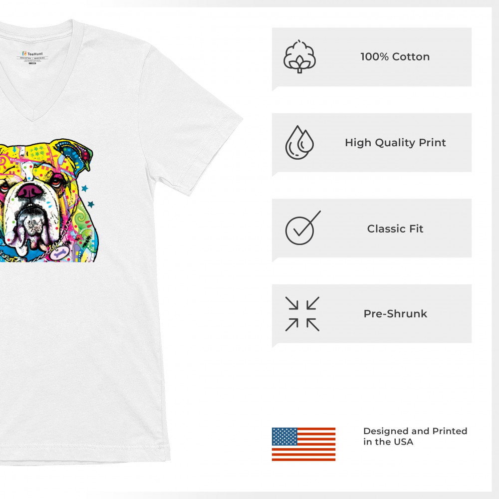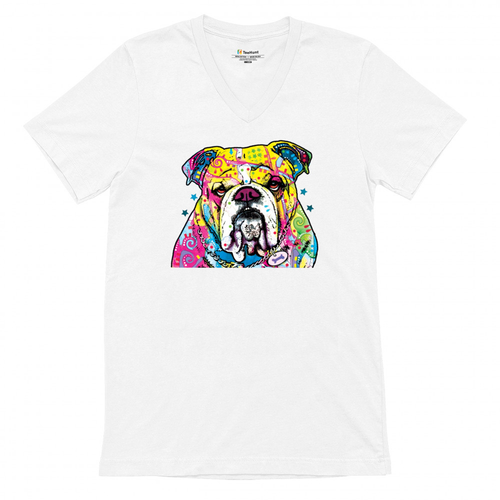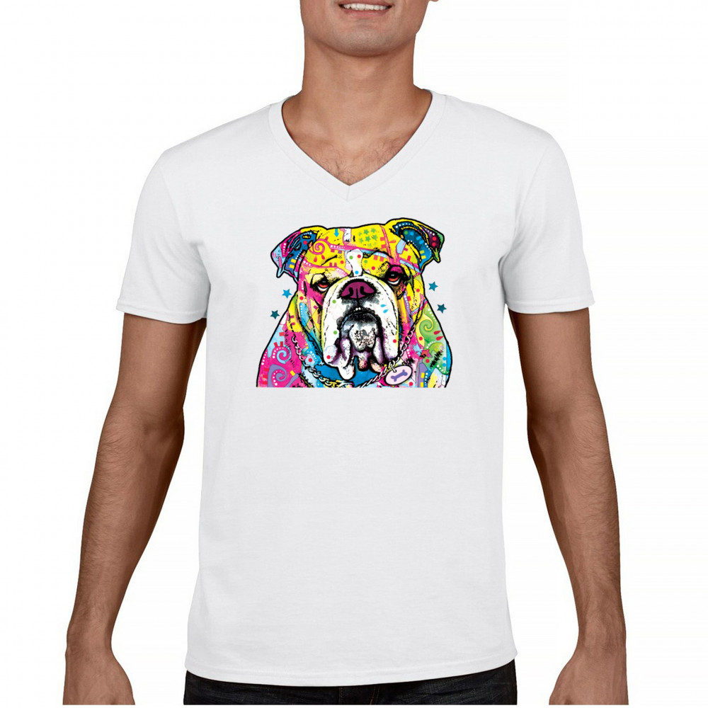 DEAN RUSSO SERIOUS BULLDOG v-neck t-shirt colorful dog best friend tee white