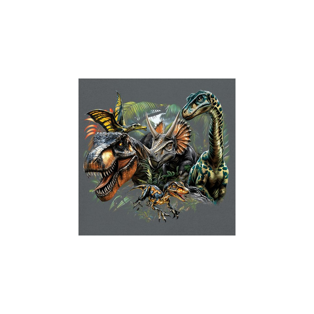 Bold jungle dinosaur design featuring t rex, triceratops, raptor, brachiosaurus, and pteranodon. Perfect for parties, digs, and dino fans.