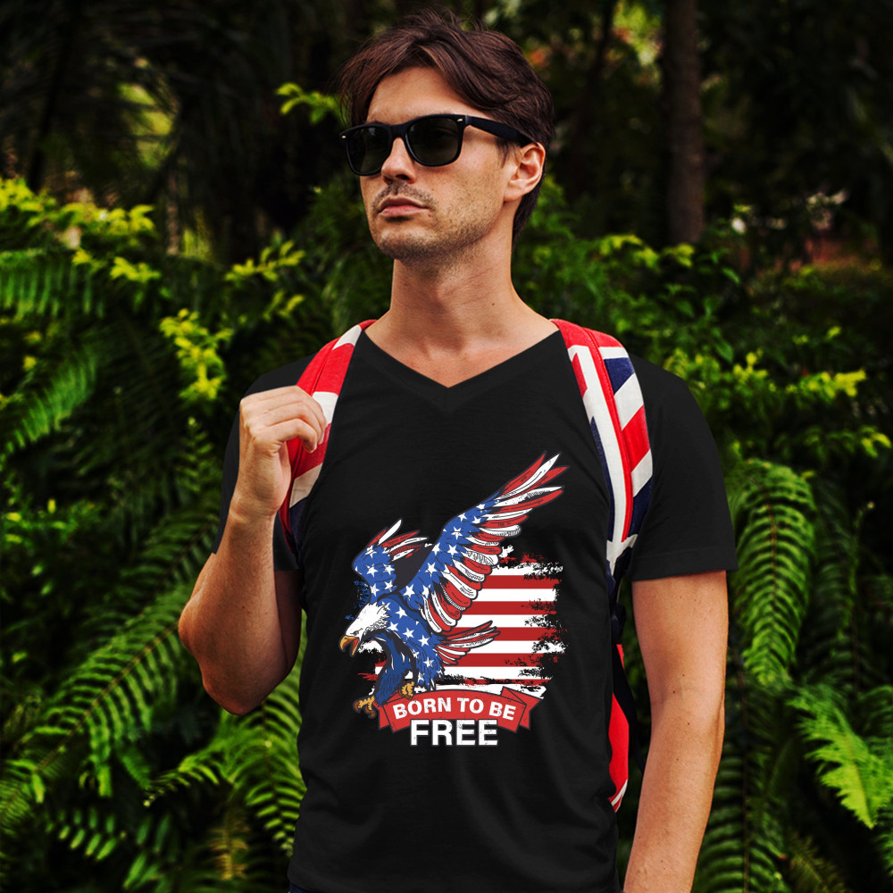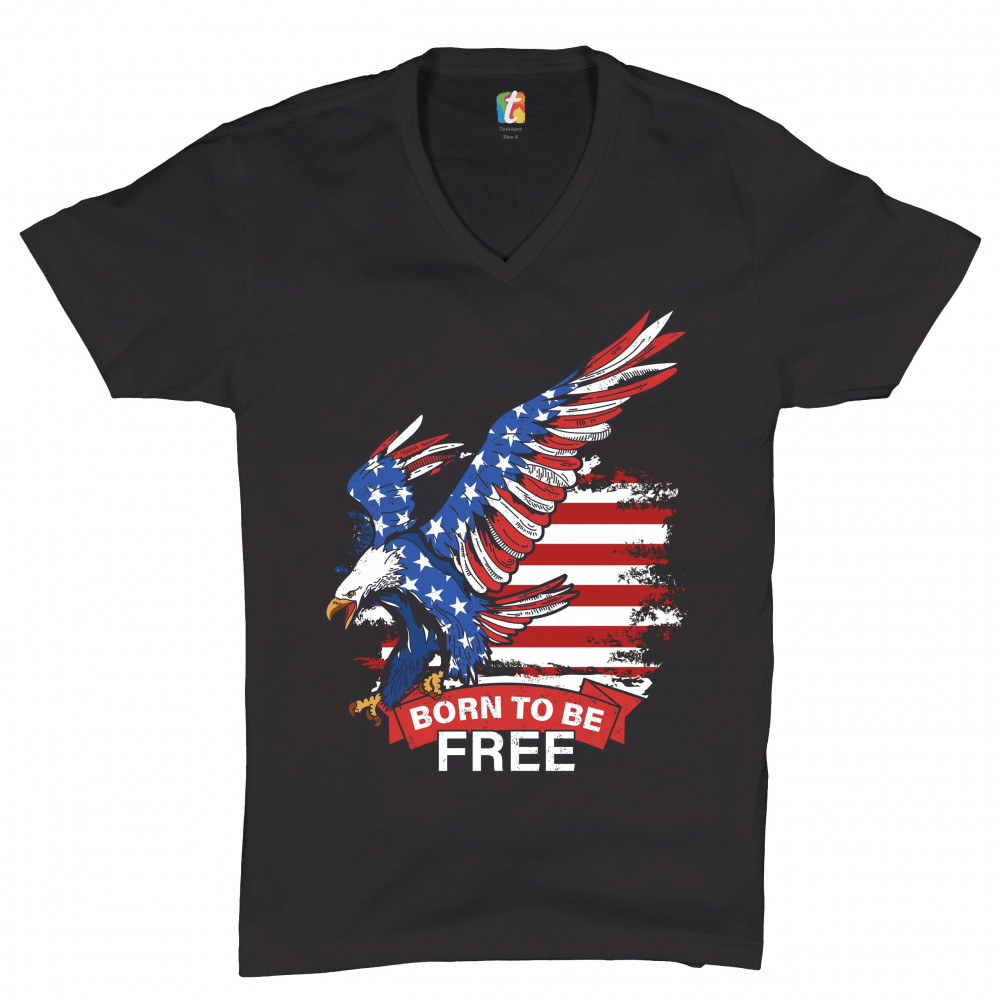 A patriotic print saying "Born to Be Free" and featuring a diving American Bald Eagle. In the background there is a distressed American Flag and the eagle is covered with Stars and Stripes. Great choice to wear on Independence Day or any other patriotic h