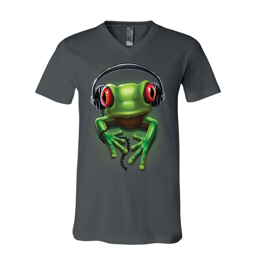 DJ FROG WITH HEADPHONES v-neck t-shirt cute animal music wildlife rock tee charcoal