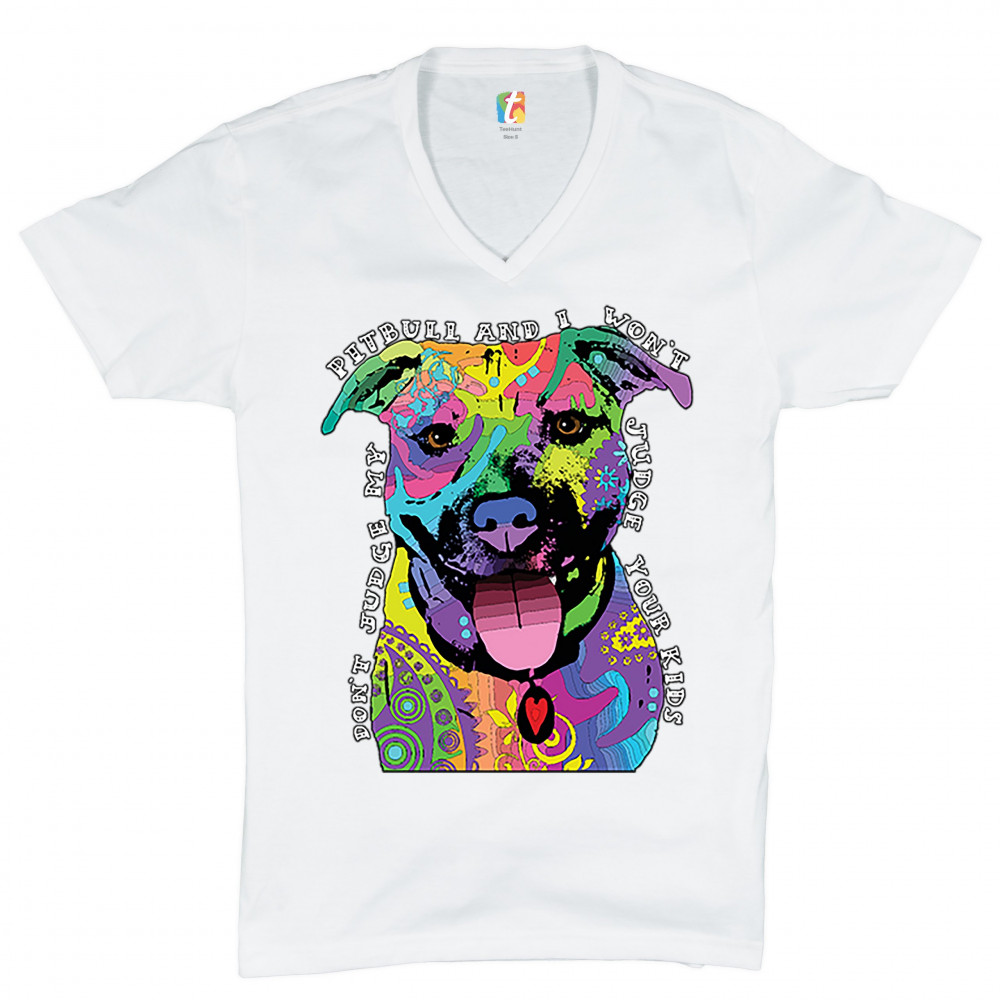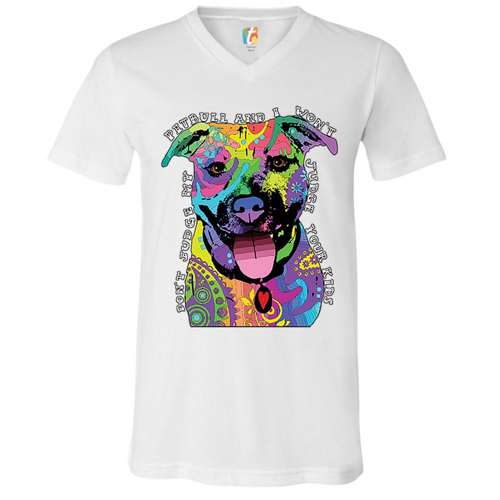 DON'T JUDGE MY PIT BULL v-neck t-shirt funny andy maxx dog lover pet owner tee white