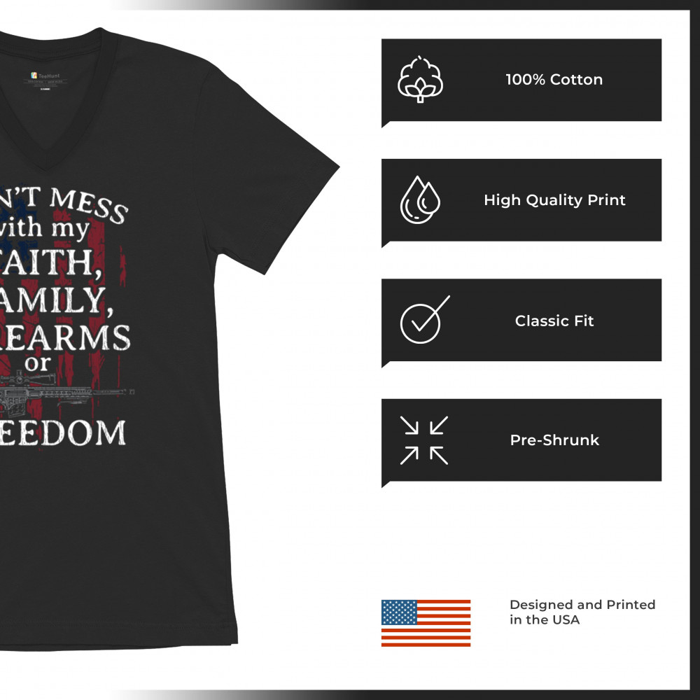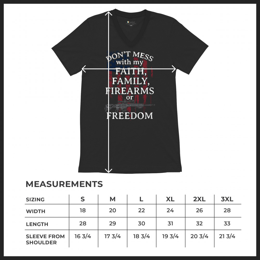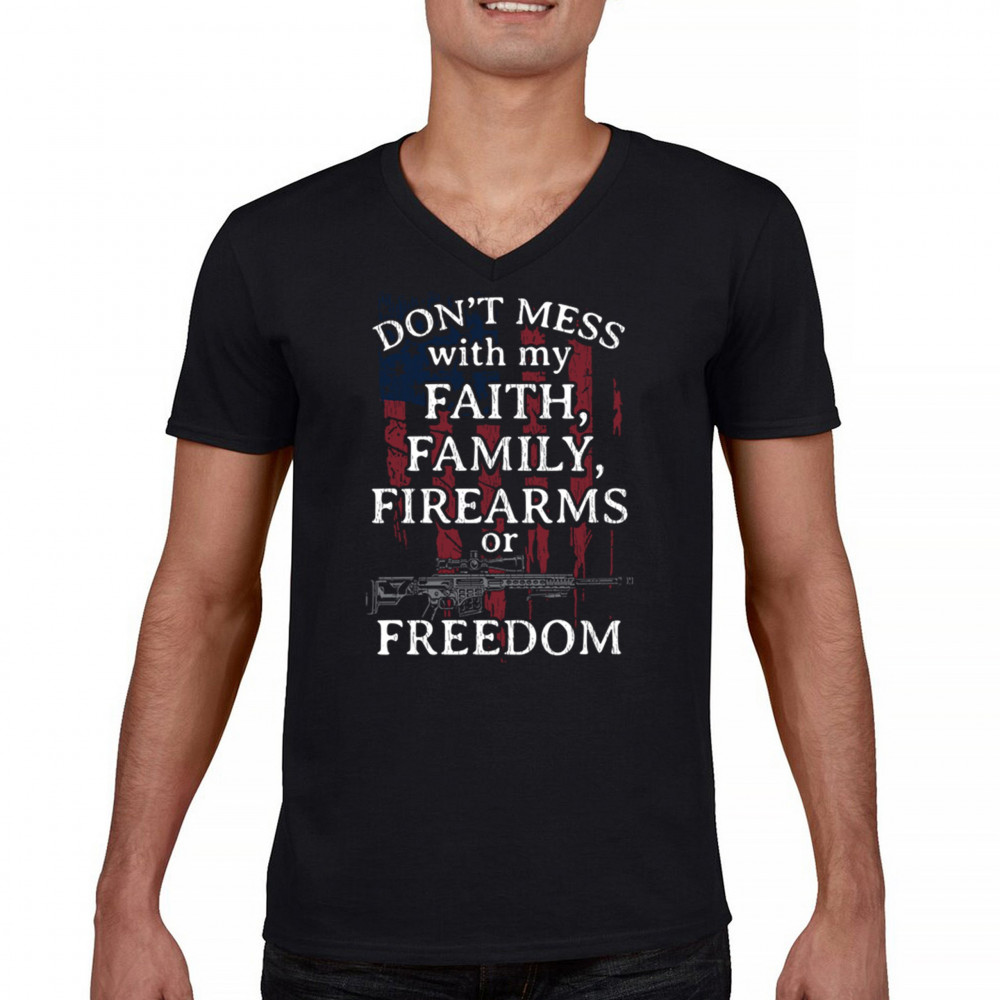 Celebrate your patriotism and core values with this powerful shirt featuring "Don't Mess with My Faith, Family, Firearms, or Freedom" set against a distressed American flag. This shirt is perfect for patriots, veterans, and those who hold their religious beliefs and the right to bear arms in high regard. Made from high-quality fabric, it ensures comfort and durability for everyday wear. Wear it proudly at patriotic events, on the 4th of July, or anytime you want to make a strong statement about your beliefs. It’s an excellent gift for anyone who shares these values and supports the American flag and the stars and stripes.