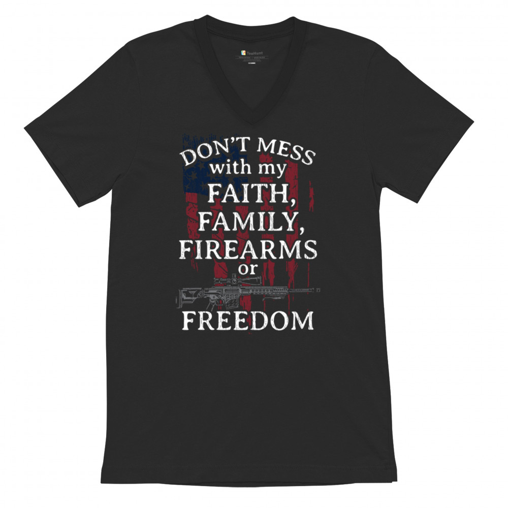 Patriotic shirt with "Don't Mess with My Faith, Family, Firearms, or Freedom" over distressed American flag. Perfect for patriots and veterans.