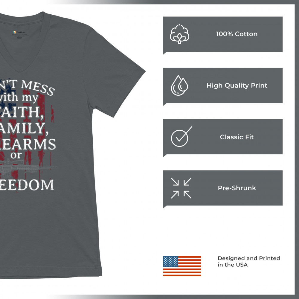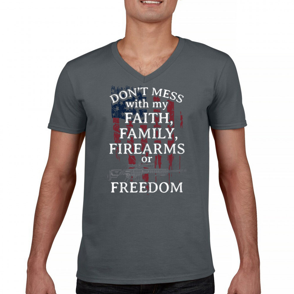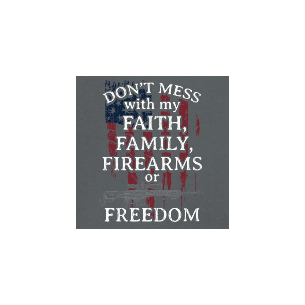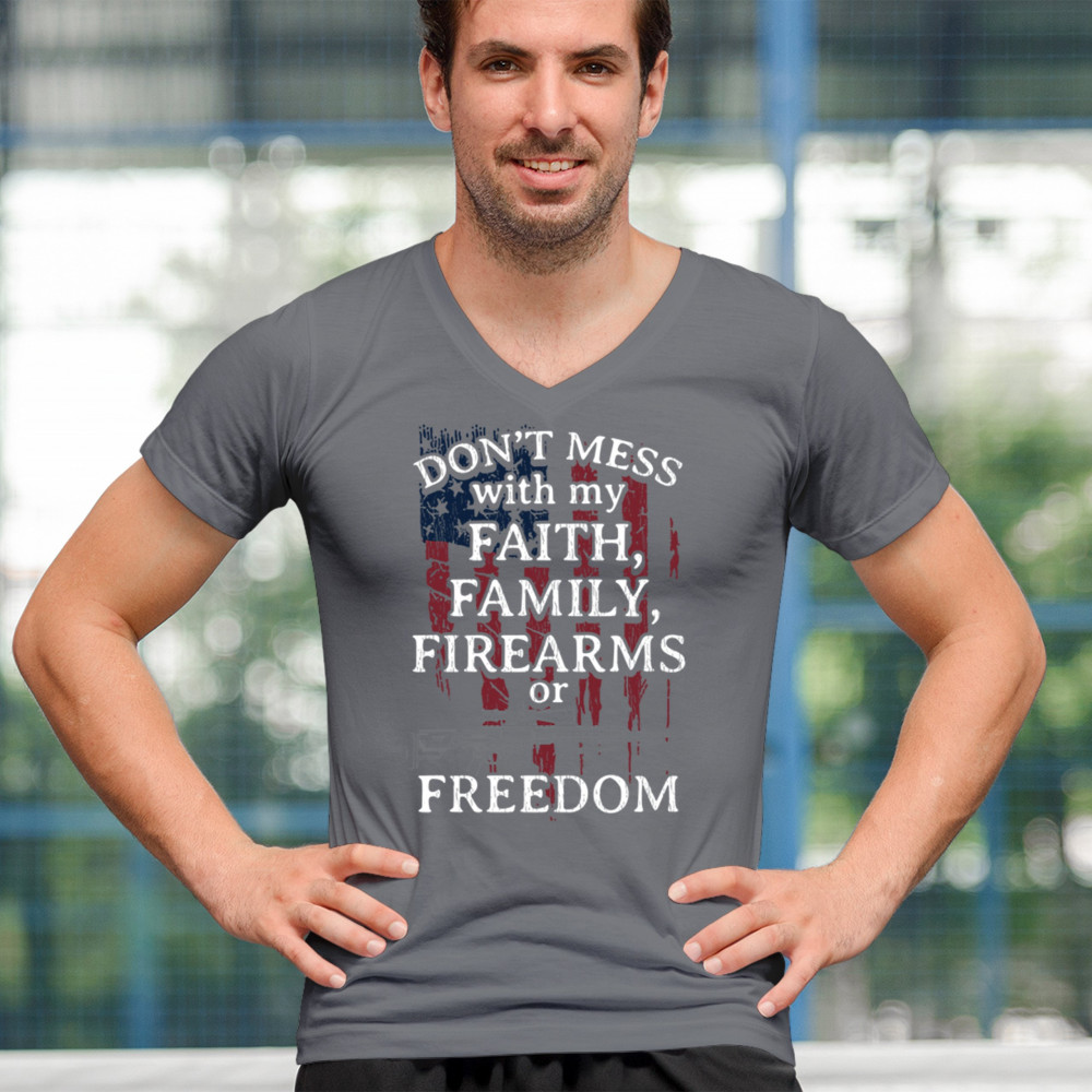 Patriotic shirt with "Don't Mess with My Faith, Family, Firearms, or Freedom" over distressed American flag. Perfect for patriots and veterans.