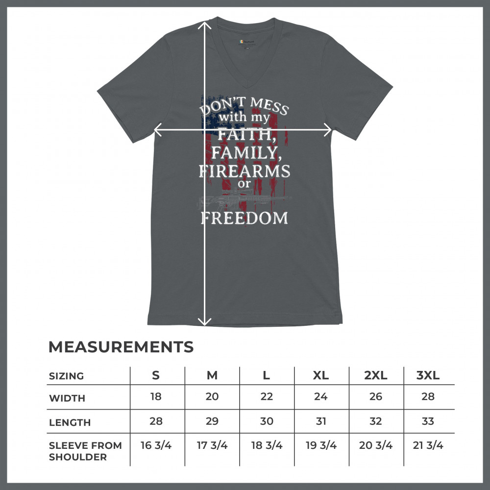 Celebrate your patriotism and core values with this powerful shirt featuring "Don't Mess with My Faith, Family, Firearms, or Freedom" set against a distressed American flag. This shirt is perfect for patriots, veterans, and those who hold their religious beliefs and the right to bear arms in high regard. Made from high-quality fabric, it ensures comfort and durability for everyday wear. Wear it proudly at patriotic events, on the 4th of July, or anytime you want to make a strong statement about your beliefs. It’s an excellent gift for anyone who shares these values and supports the American flag and the stars and stripes.