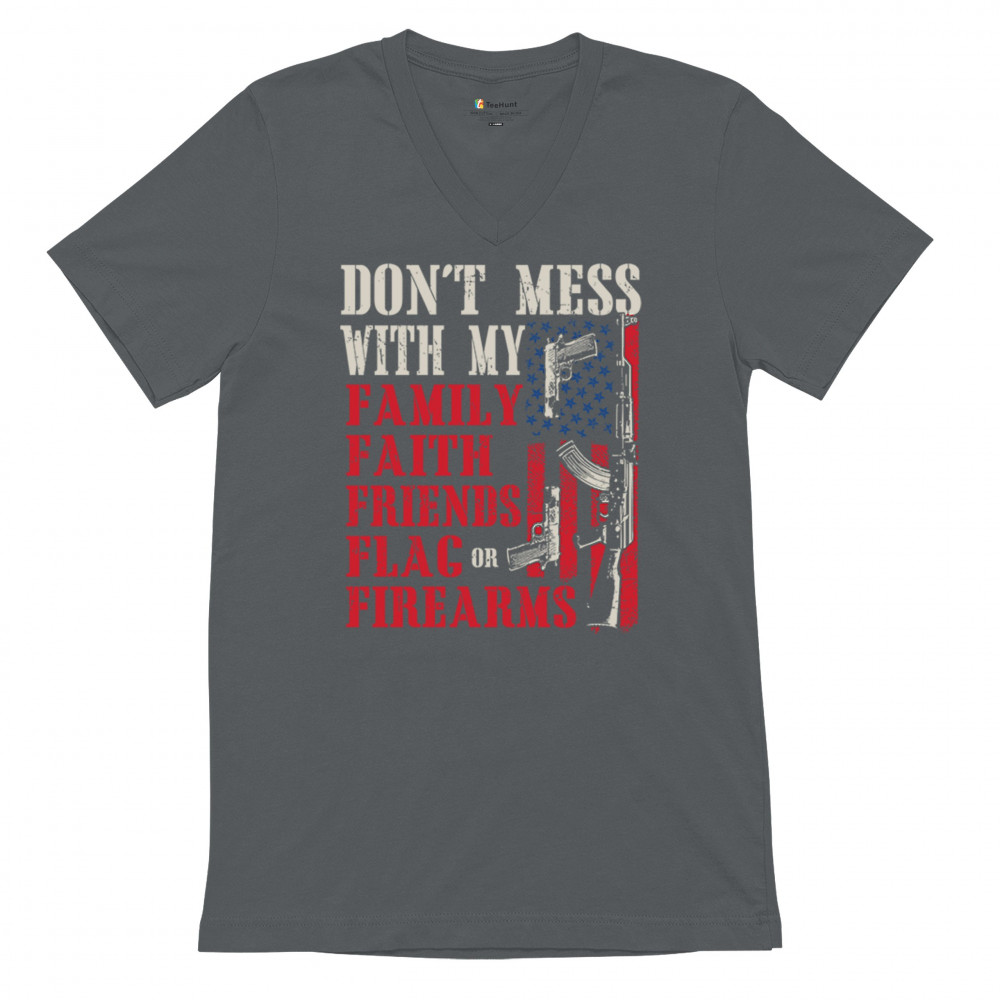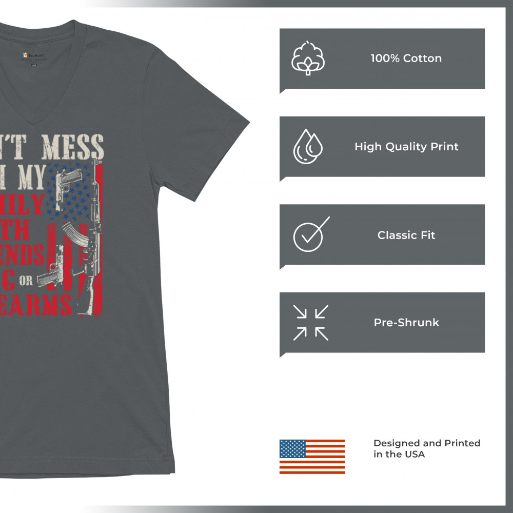 Patriotic design for gun owners and liberty-lovers. Bold message defends family, flag, and firearms with unapologetic American pride.