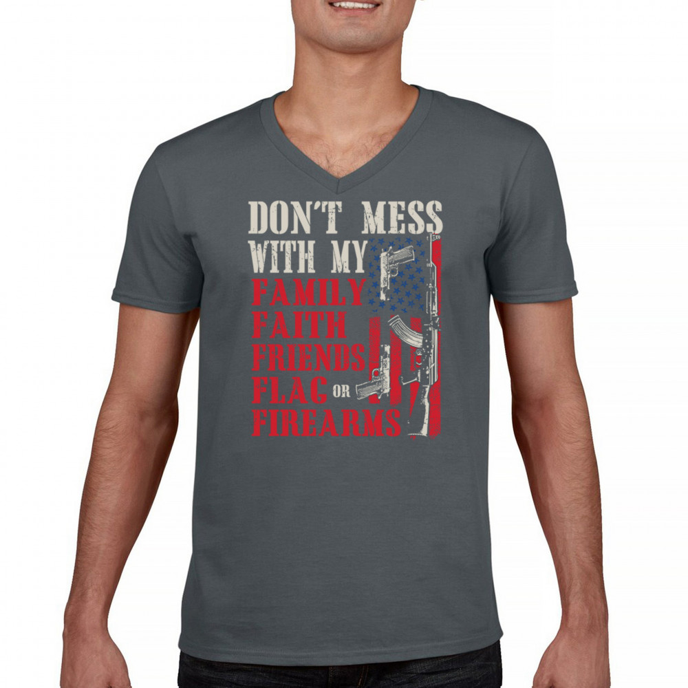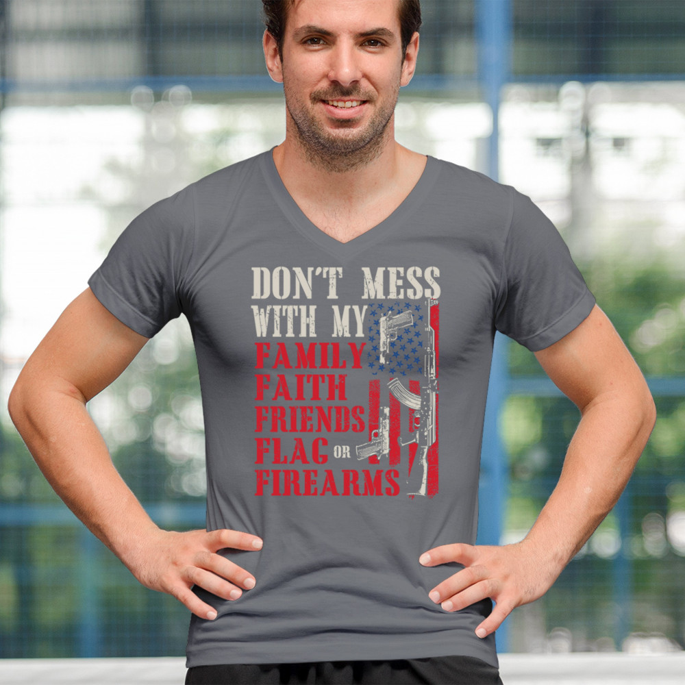 Don’t mess with a patriot’s core. This powerful design shouts loyalty to family, faith, friends, flag, and firearms. Featuring bold lettering on an American flag backdrop, it’s made for defenders of freedom, gun rights, and American values. Ideal for veterans, 2A supporters, and anyone who won’t back down from defending what they love.