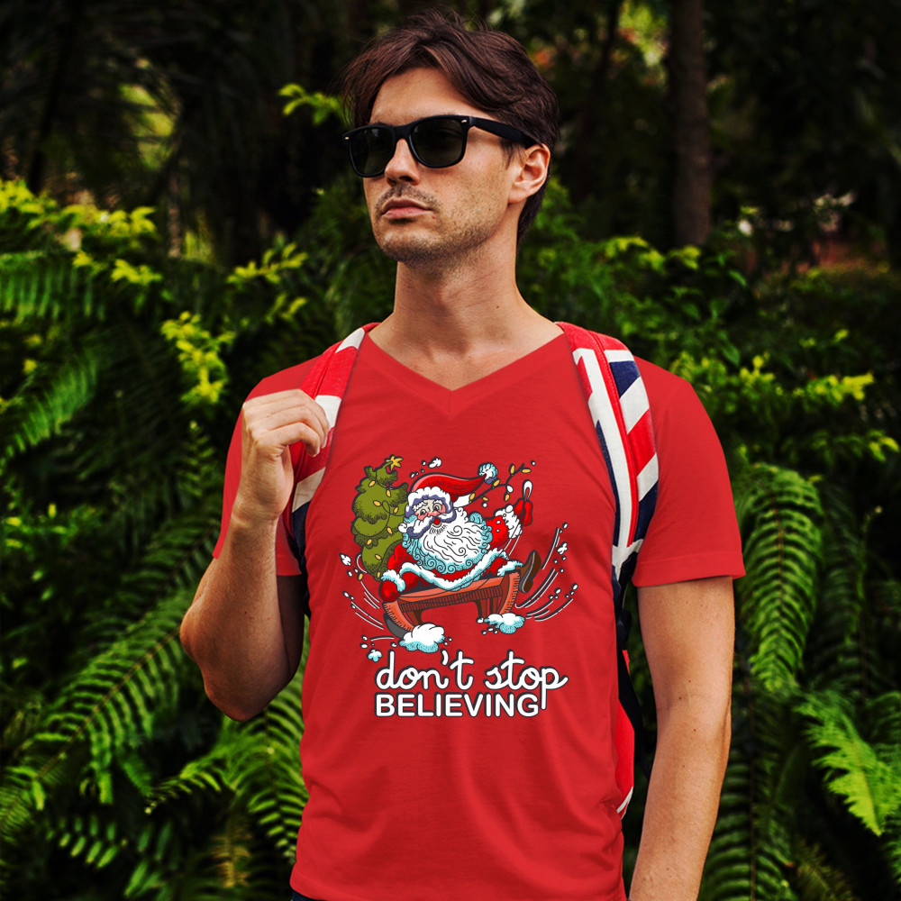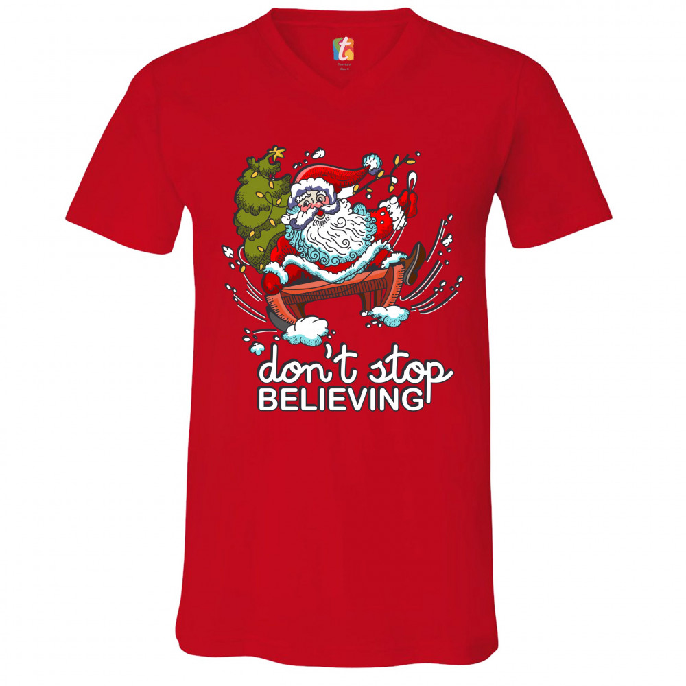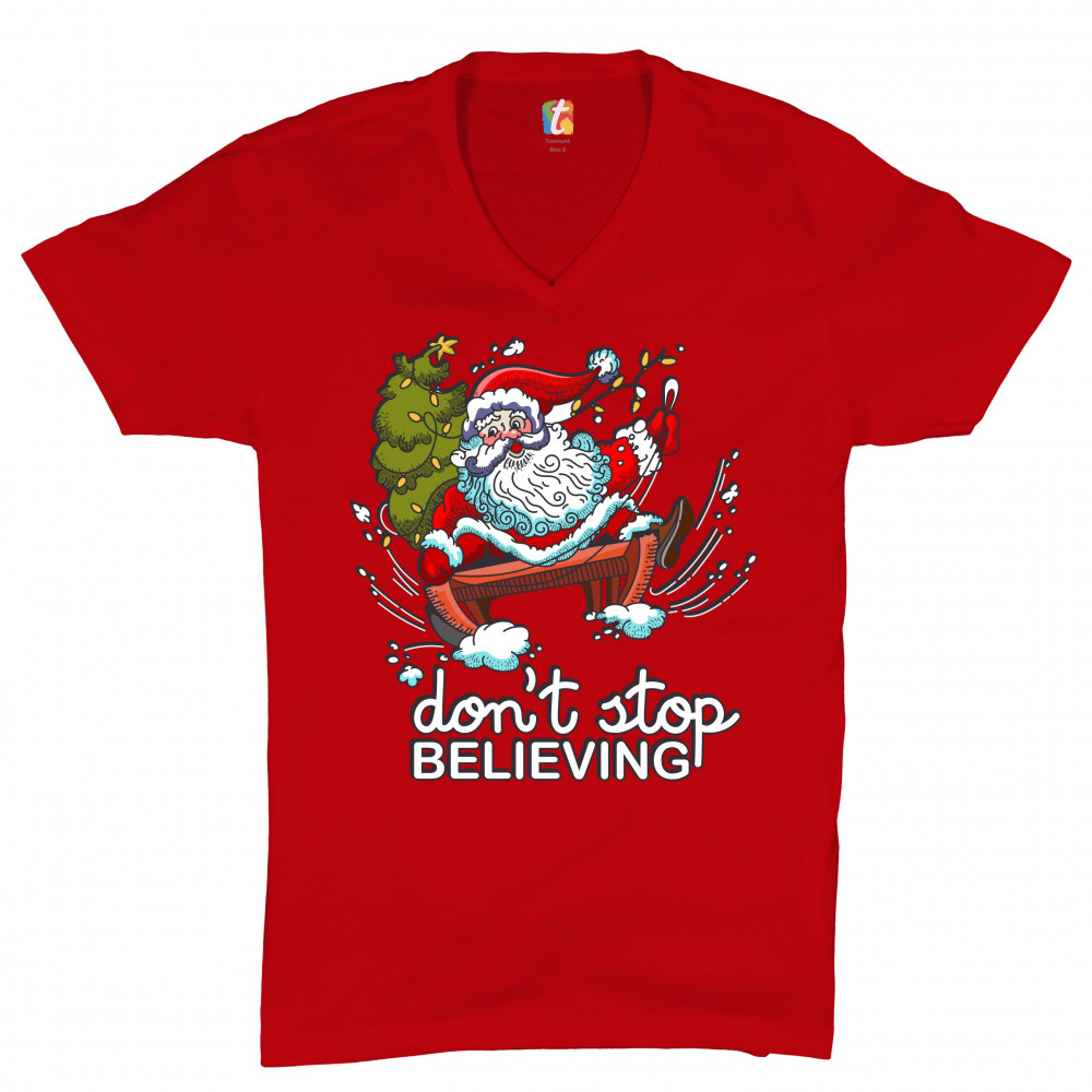 DON'T STOP BELIEVING v-neck t-shirt christmas holiday spirit santa claus tee red