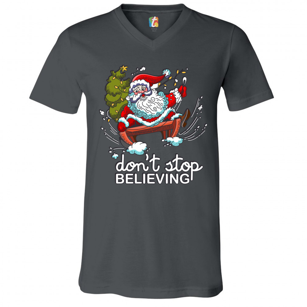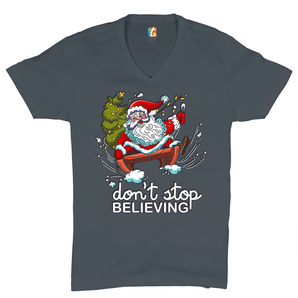 DON'T STOP BELIEVING v-neck t-shirt christmas holiday spirit santa claus tee charcoal