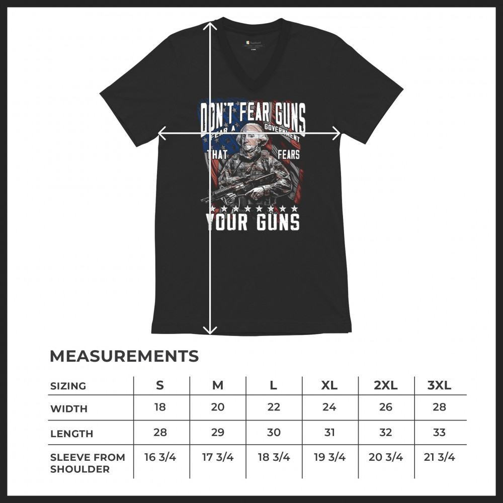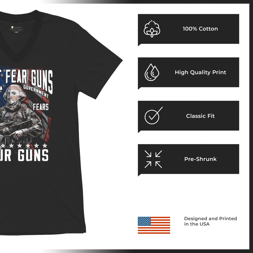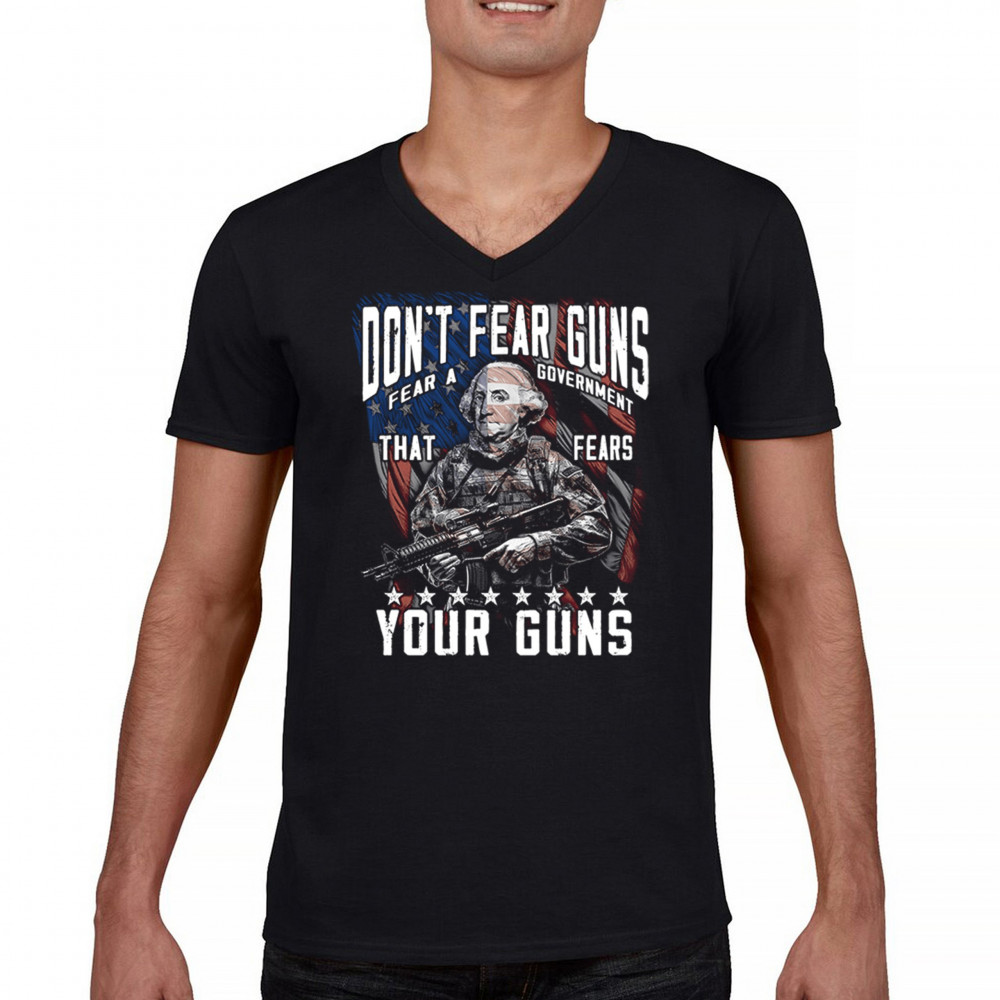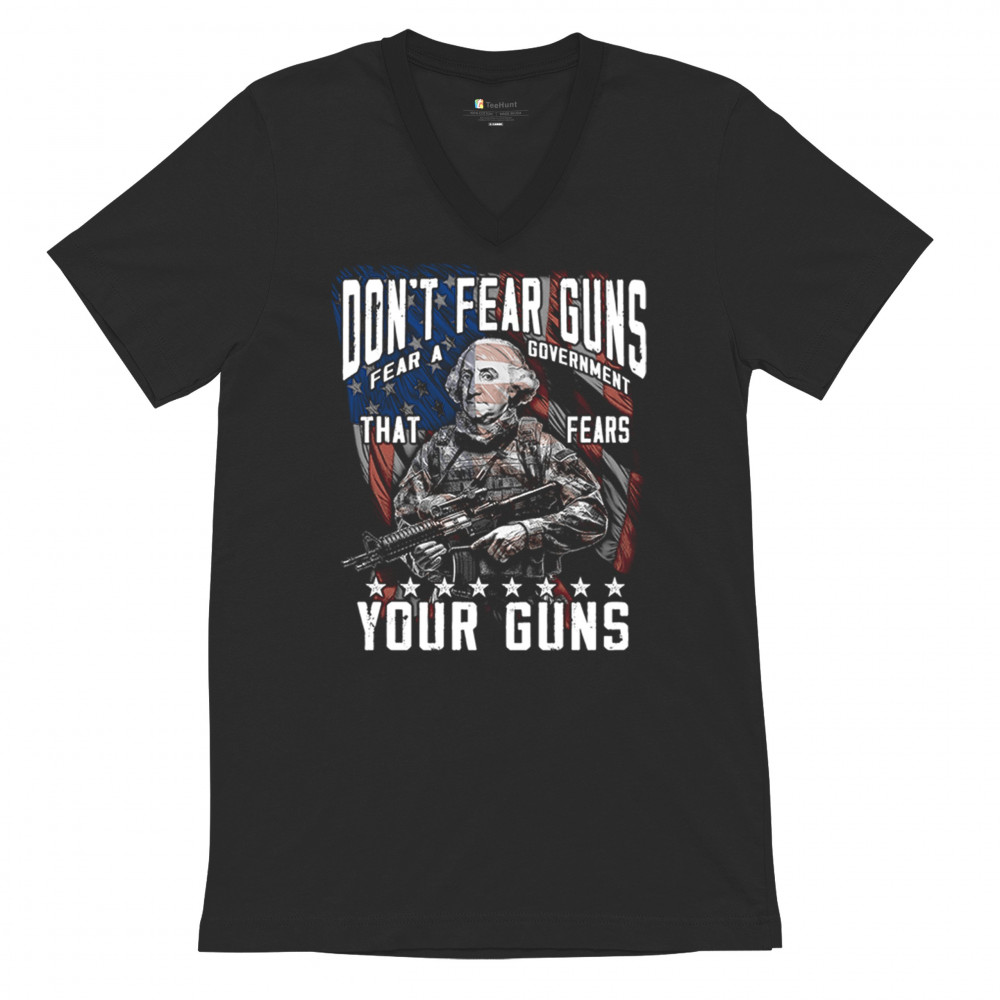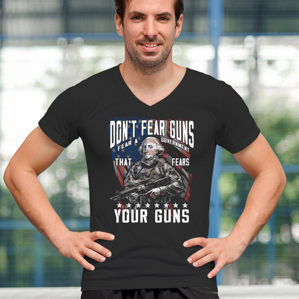 A fierce tribute to liberty, this design shows George Washington armed in tactical gear with the message "Don't Fear Guns, Fear a Government That Fears Your Guns." Perfect for 2nd Amendment patriots, protestors, and anyone who believes in self-defense and personal freedom. A bold, graphic statement for gun rights and political awareness.