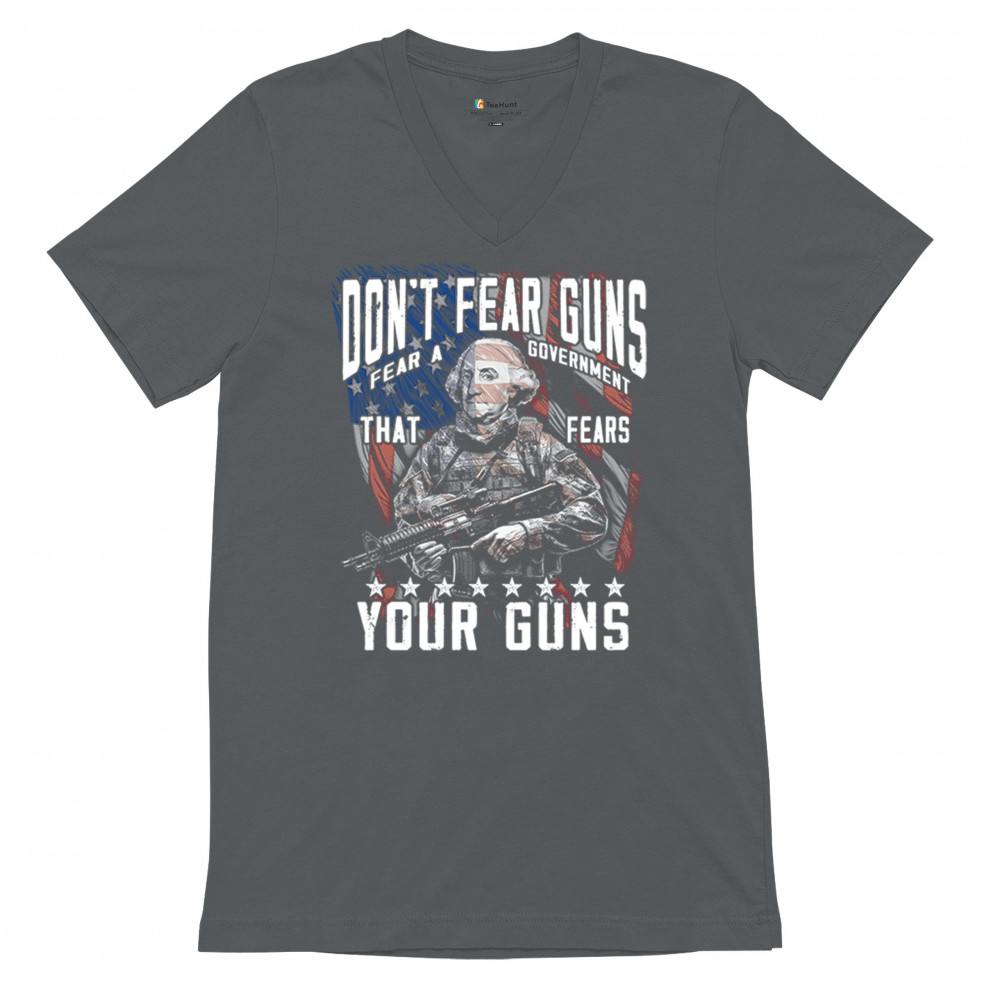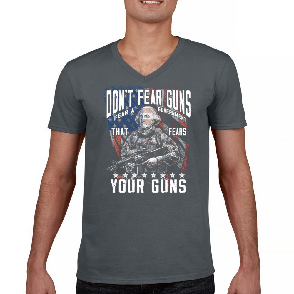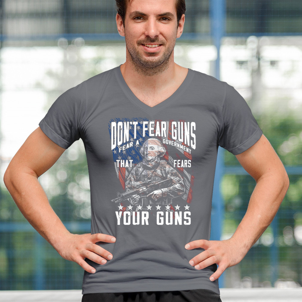 A fierce tribute to liberty, this design shows George Washington armed in tactical gear with the message "Don't Fear Guns, Fear a Government That Fears Your Guns." Perfect for 2nd Amendment patriots, protestors, and anyone who believes in self-defense and personal freedom. A bold, graphic statement for gun rights and political awareness.